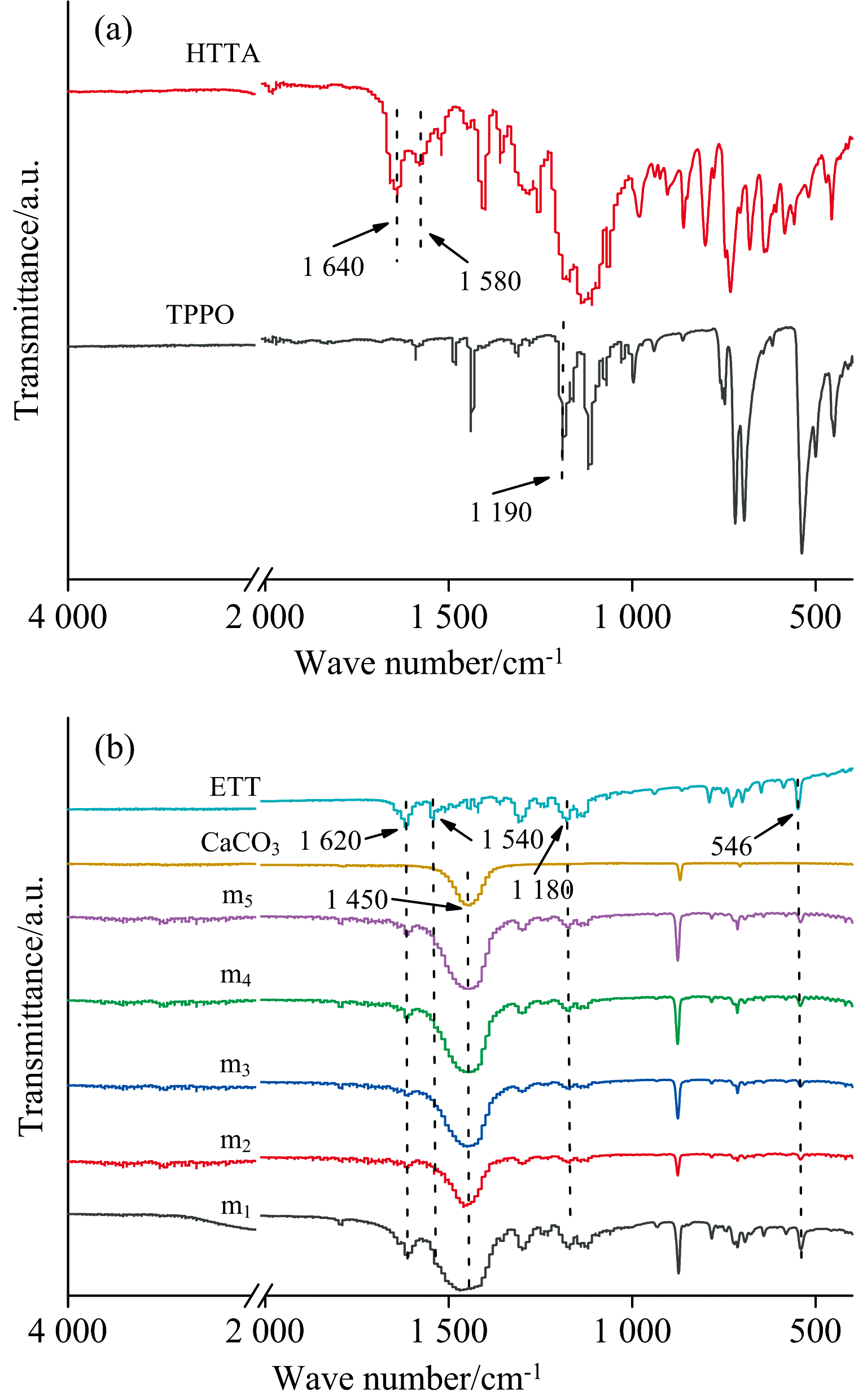 图2(a)是HTTA和TPPO的红外光谱图。 在HTTA中1 640和1 580 cm-1的C=O伸缩振动峰在ETT中红移到了1 620和1 540 cm-1[图2(b)], TPPO的1 190 cm-1处P=O键伸缩振动峰在ETT中红移到了1 180 cm-1, 并且ETT在546 cm-1出现了Eu— O伸缩振动峰, 表明HTTA、 TPPO与铕离子配位形成了铕配合物[18]。 从m1~m5样品的红外图谱中可观察到在1 620、 1 180和546 cm-1等附近出现红外特征峰, 与ETT的红外特征峰的波数相近, 说明m1~m5样品中均含有ETT。