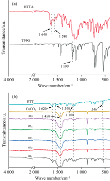 作为对照, 不使用CaCO3, 添加3 mmol三乙胺做碱, 其余条件与制备m1一致, 制备得到纯的Eu(TTA)3(TPPO)2(ETT)荧光材料[7]。