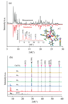 图3(a)是ETT粉末的XRD图谱和ETT晶体模拟的XRD图谱。 在7.80° 、 8.36° 、 8.56° 和9.08° 等处有较强的尖峰, 对应ETT的(010)、 (011)、 (100)和(0-11)晶面(ETT晶体的cif文件模拟)。 在图3(b)中, m1~m5样品在7.78° 、 8.34° 、 8.56° 和9.06° 附近有特征衍射峰, 这说明m1~m5样品中含有铕配合物。 在23.02° 、 29.38° 、 35.94° 等处特征衍射峰对应CaCO3的(012)、 (104)、 (110)晶面(PDF#47-1743)。 m1~m5样品在9.08° 和10.44° 处只有m1和m2有特征衍射峰, 并且特征衍射峰越来越弱, 这是由于CaCO3增多, ETT含量相对减少导致。 m1~m5样品中的ETT特征衍射峰相较于纯ETT的特征衍射峰位移微小, 说明ETT与CaCO3相互作用较小。