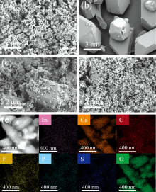 如图4(a)SEM所示, CaCO3为短棒状(长约300~600 nm, 宽约200 nm)和类球形纳米颗粒(约200 nm)。 相比之下, [图4(b)]ETT呈微米级不规则立方大颗粒(长约2~6 μ m, 高约2 μ m, 宽约2 μ m)。 观察到m1[图4(c)]里有较大ETT颗粒, 这是ETT晶体; 随着CaCO3用量的增加, ETT的晶体颗粒变少, 在使用5 g CaCO3制备的样品m5[图4(d)]里已无明显ETT的晶体颗粒, 说明增大CaCO3用量, 提供更多的附着位点有利于ETT在碳酸钙表面分散和附着, 而不再形成晶体大颗粒。 如[图4(e)], m1样品(TEM的EDS)中短棒状CaCO3颗粒表面可观察到Eu、 S、 F、 P等元素, 这些元素来自于ETT; 各元素在复合荧光材料表面分布比较均匀。