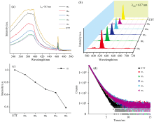 合成的ETT单晶的晶体结构示意图[图3(a), 右下插图]可直观看出Eu3+与三种不同环境的氧配位, Eu3+分别处在HTTA上酮羰基的两种配位环境和三苯基氧化磷上磷氧基的一种配位环境中。 各样品均按三阶拟合, 有三个寿命。 ETT的平均荧光寿命为0.545 ms, m1~m5样品的平均荧光寿命范围为0.555~0.584 ms; 结合XRD的分析表明CaCO3的存在微扰了ETT周围的环境, 使得m1~m5样品的平均荧光寿命发生了改变。