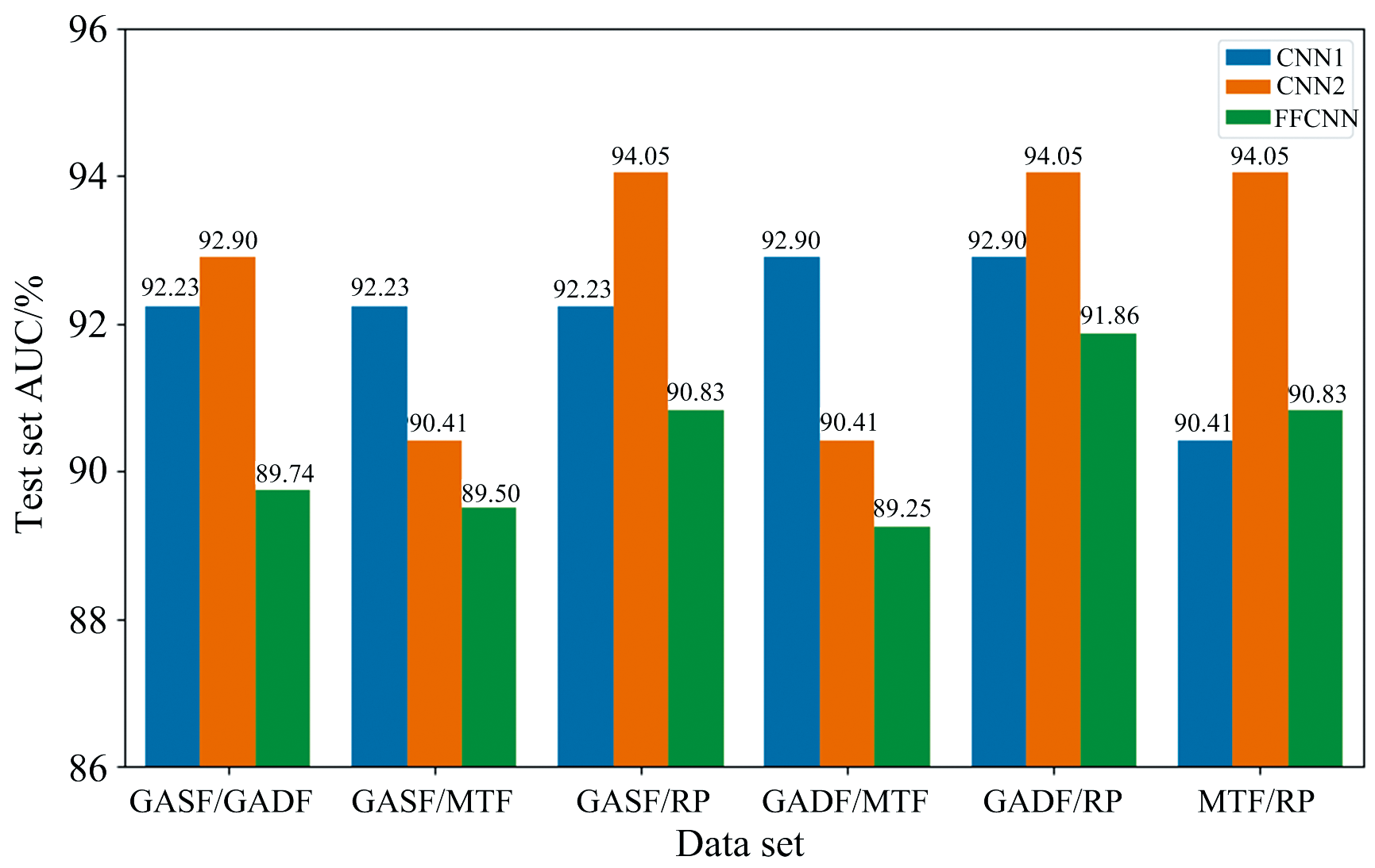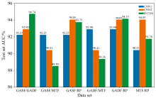 MFCNN是GASF、 GADF、 MTF和RP四种图像各自经过卷积层以及池化层进行特征提取后, 将它们的特征相互沿一个维度拼接成一个一维特征, 最后再进行多层全连接层实现分类。 利用两两融合的方式可以获取6种融合下的模型结果, 分别对每种情况下的MFCNN模型进行训练和测试, 将其训练结果和对应单一图片输入的结果显示在图4中。 从结果可以看出MFCNN模型对数据特征更为敏感, 因为中端融合通过卷积和池化操作提取每个数据集的深层特征, 提供了对数据集特征的更细致的组合能力。 这种灵活性可能使模型在适当的融合策略下表现出更优的性能, 因此MFCNN模型有着最好的预测效果的模型, 就是GASF和GADF中端融合的模型, 测试集AUC值达到了94.74%。 但同时因为不同数据集的特征分布、 特征尺度等信息不够一致, 可能导致特征冲突或冗余信息堆积, 从而降低模型性能, 因此MFCNN模型有着最差的预测效果的模型。 而且通过结果可以发现在其他图像与MTF进行融合的时候, 模型都会相比融合前效果更差, 因此在这些图像中MTF与其他图像可能存在特征冲突等关系, 从而导致MTF与其他图像融合模型效果变差, 所以在后续更多图像融合时就不考虑把MTF融合进去。