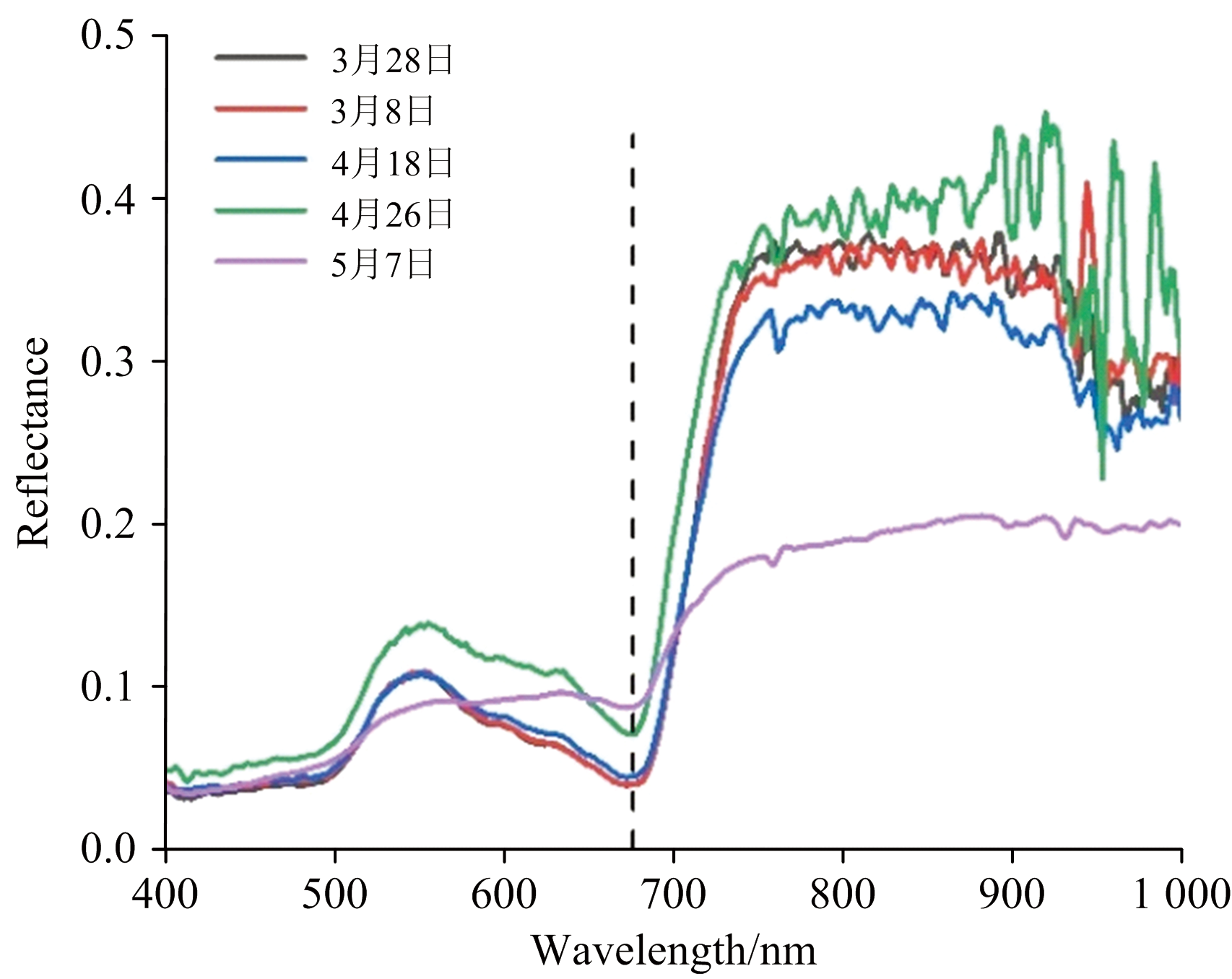将5个采集日的55个小区的反射光谱求平均值, 得到每个采集日的油菜平均反射光谱, 原始的平均光谱曲线如图3所示。 可以看出, 第一个波峰出现在550 nm附近, 对应的是绿光; 在676 nm附近出现波谷, 对应的是红光; 在687~730 nm波段内, 前4个采集日的反射率陡然上升, 而后反射率不断波动; 在769 nm之后, 第5个采集日的反射率基本在0.18~0.20之间。