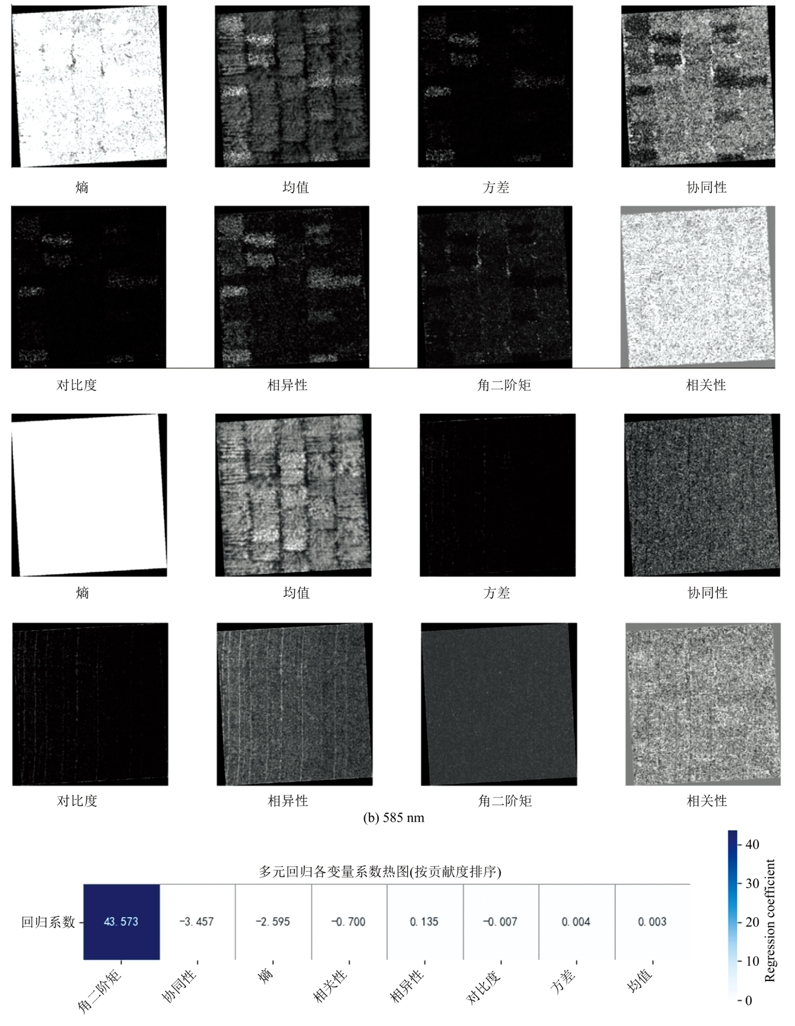 为了捕捉光谱中的细微变化, 将移动步长设为1和2, 选择的相对较小的窗口大小为5× 5和7× 7, 同时为了充分获取不同方向上的纹理变化特征, 设置0° 、 45° 、 90° 、 135° 这4个方向, 求得所有方向上的纹理特征参数取平均。 基于灰度共生矩阵计算的纹理特征通常是针对高光谱图像的单个波段进行的。 不同波段代表了不同的频谱信息, 反映的是地面作物对不同频率光波的吸收和散射特征。 图5(a)和(b)展示了414和585 nm处的纹理特征示意图, 可以看出不同波段在8个纹理特征上有明显的差异。 进一步将这8个纹理特征与含水率实测值进行多元回归, 如图5(c)所示, 角二阶矩贡献度最大, 其代表图像灰度的均匀分布程度, 当含水率减小, 表面纹理变粗糙, 像素对的灰度差异较大, 角二阶矩较小。