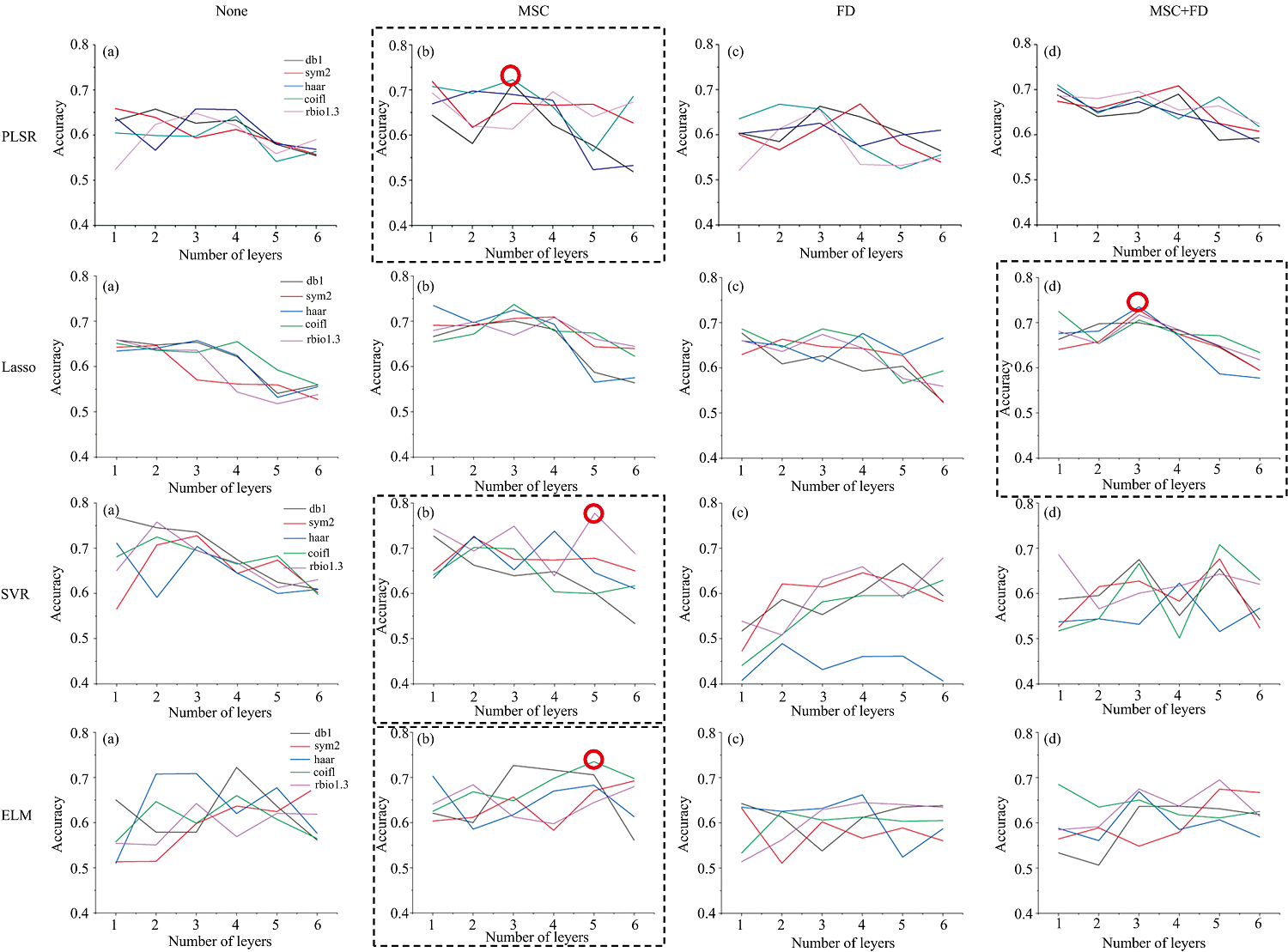 不同的预处理方式下建立PLSR、 Lasso、 SVR和ELM模型的预测效果如6所示。 建立的PLSR模型的准确率在0.520 7~0.722 7间, 其中经过MSC处理之后, 经过coif1小波基函数3层变换后准确率最高, 测试集的准确率为0.722 7。 建立Lasso模型的准确率在0.517 8~0.735 4之间, 其中经过MSC+FD处理之后, 经过haar小波基函数3层变换后准确率最高, 测试集的准确率为0.735 4。 建立SVR模型的准确率在0.407 8~0.777 4之间, 其中经过MSC处理之后, rbio1.3小波基函数5层变换后准确率最高, 测试集的准确率为0.777 4。 ELM模型的准确率在0.513 1~0.735 0之间, 其中经过MSC处理之后, coif1小波基函数5层变换后准确率最高, 测试集的准确率为0.735 0。 对比所有组合预测效果, 算法组合MSC-5-robi1-SVR预测效果最好。 研究结果表明, 经过预处理之后的模型均比未处理的数据建模效果更好, MSC方法的处理效果要优于FD处理, 这说明大气散射对高光谱数据的影响较大, 经过MSC处理后能够提高模型的准确性。