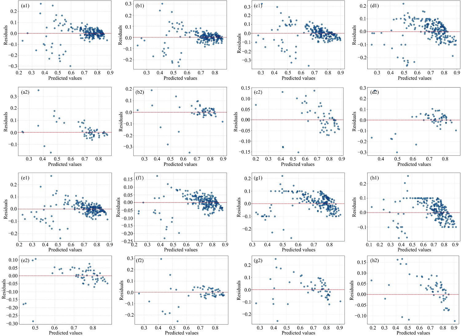 引入纹理信息之后, MSC+FD-3-haar-Lasso和MSC-5-rbio1.3-SVR这两个模型的训练集的R2和RMSE均增加, 测试集均减少, 对应的残差分布图如图7(b1)、 (b2)和(d1)、 (d2), 测试集(b2)和(d2)均有呈曲线变化的趋势, 说明模型可能未捕捉到数据的非线性关系。 分析可知, 经过离散小波分解后, 再引入空间纹理信息, 模型测试集准确率减少。 这是由于离散小波分解通过不同的小波基函数, 经过了一系列数学变换后保留下近似系数, 数据的物理意义发生了变化, 引入纹理参数后对经过离散小波变换后的数据产生了影响, 使得模型预测效果变差。 而建立MSC+FD-CARS-IRIV-Lasso模型和MSC-CARS-SVR模型时, 训练集和测试集的R2和RMSE均增加, 对应的残差分布图如图7(f1)、 (f2)和(h1)、 (h2), 残差均随机分布在0附近, 且没有明显的模式。 分析可知, 预处理之后的数据经过CARS、 IRIV和CARS-IRIV进行特征筛选后, 再引入空间纹理信息, 建立的预测模型的测试集准确率提升了。