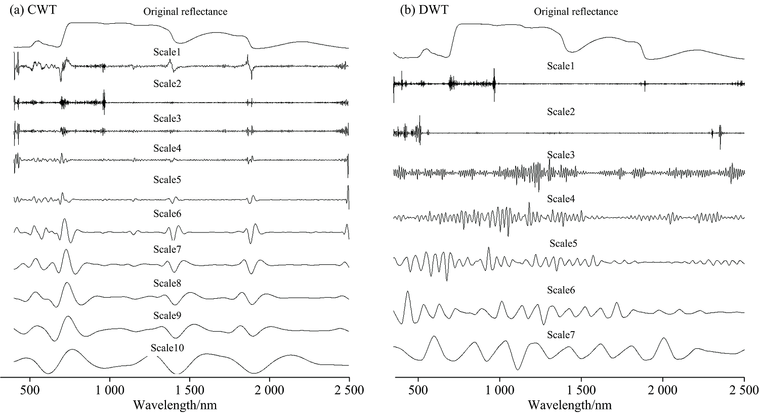 小波变换, 又称为小波分析, 是一种新的变换分析方法。 它继承和发展了短时傅里叶变换局部化的思想, 同时克服了窗口大小不随频率变化等缺点。 小波变换能够提供一个随频率改变的“ 时间-频率” 窗口, 是进行信号时频分析和处理的理想工具。 小波变换包括两种变体: 离散小波变换(discrete wavelet transform, DWT)和连续小波变换(CWT)[9]。 前一种方法主要用于数据压缩和特征提取, 后者倾向于生成更易于解释的信号多尺度表示(表2)。 本研究通过对叶片高光谱反射率进行小波分解, 降低了尺度图的维度。