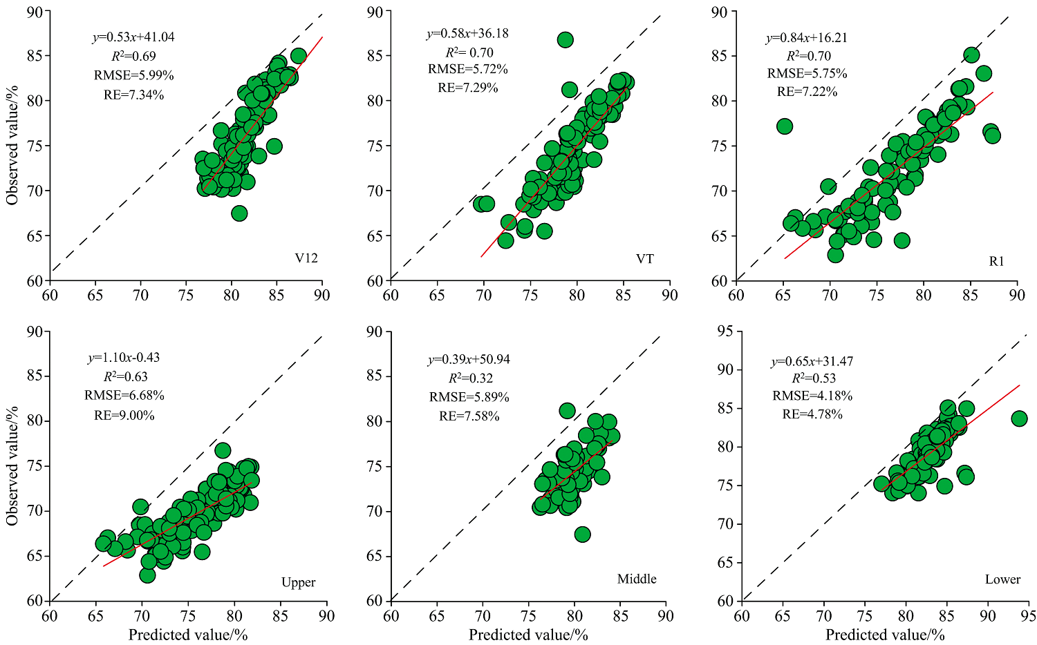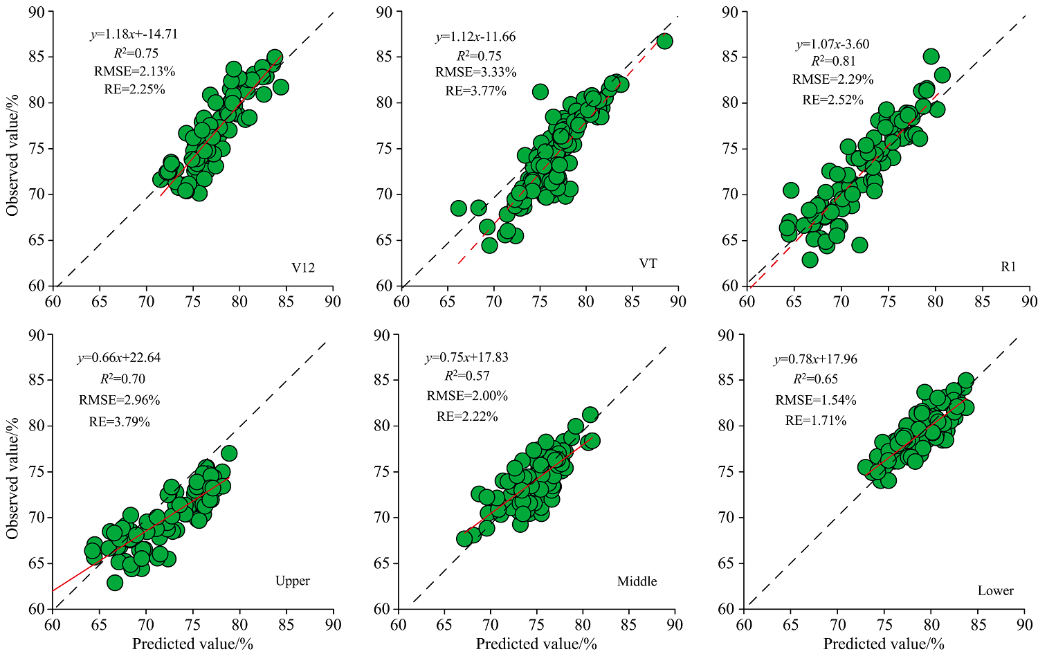 ![]() | 表3 关键生育时期和不同层位叶片含水量与光谱指数的决定系数 Table 3 Correlation coefficients between leaf water content and spectral index at key growth periods and different layers |