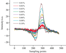 为使激光器波长与CO气体吸收谱线中心匹配, 设定激光器温度为27.23 ℃, 扫描频率为100 Hz, 调制频率为97 kHz, 电流为80.82 mA。 试验开始前, 采用铂唯YQB-731L流量计, 将体积浓度为0.10% CO气体与高纯氮气混合, 调配CO浓度为0.01%、 0.02%、 0.03%、 0.04%、 0.05%、 0.06%、 0.08%和0.10%, 待气体流量稳定并充分混合后, 通过TDLAS气体检测设备测量CO吸收光谱数据, 结果如图5所示。