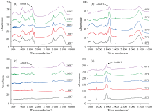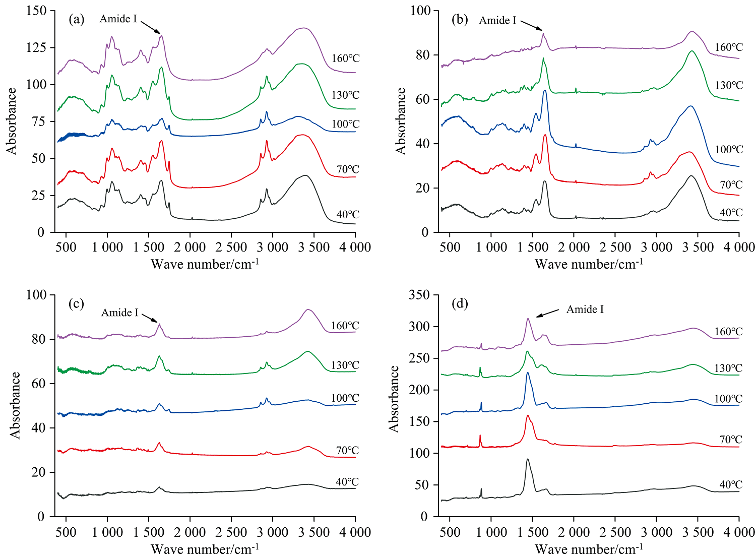 图1是不同榨油温度下核桃蛋白组分的红外光谱图, 图中的酰胺Ⅰ 带(1 600~1 700 cm-1)常被用于分析蛋白质的二级结构, 1 610~1 640 cm-1被指认为β -折叠、 1 640~1 650 cm-1被指认为α -螺旋、 1 660~1 700 cm-1被指认为β -转角、 1 650~1 660 cm-1被指认为无规则卷曲[14, 15]。 图1(a)是榨油温度对核桃清蛋白红外光谱的影响, 由图可知100 ℃红外光谱相对其他温度光谱峰整体强度降低, 但该温度下, 峰之间的相对强度未发生明显变化, 表明该峰强度整体降低主要与仪器参数变化有关, 而与蛋白结构变化关系不大。 随着榨油温度的增加, 100 ℃的酰胺I带峰型也相对于其他温度变化更大, 预示着其二级结构可能会与其他温度相比有较大的不同。 图1(b)是不同榨油温度下核桃球蛋白的红外光谱图。 随着温度的增加, 40、 70和100 ℃ 峰型相差不大, 但130和160 ℃峰型有一定的变化。 随着温度的增加, 40、 70和100 ℃球蛋白酰胺Ⅰ 带峰型相差不大, 在130和160 ℃有较为明显的变化, 表明球蛋白的二级结构含量在130和160 ℃变化显著。 图1(c)是榨油温度对核桃醇溶蛋白红外光谱的影响, 由图可知随着温度的提高, 峰型都有变化, 与清蛋白和球蛋白蛋白酰胺Ⅰ 带光谱相比, 其变化更大, 表明醇溶蛋白的二级结构变化相对会更明显。 图1(d)是不同榨油温度下核桃谷蛋白的红外光谱图, 由图可知70、 100和130、 160 ℃峰型各异, 温度超过130 ℃的谷蛋白结构变化较大。 随着榨油温度的升高, 40和100 ℃谷蛋白酰胺Ⅰ 带峰型基本一致, 70和130 ℃峰型类似。