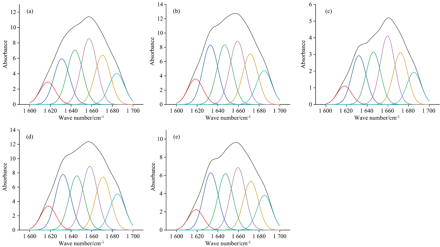 将干燥后的KBr与待测蛋白样品按1∶ 100的比例混合均匀, 压制成均匀透明薄片, 使用红外灯照射1 h干燥后放入PeakinElmer Frontier红外光谱仪中进行400~4 000 cm-1波数扫描, 使用PeakFit 4.1.2软件对酰胺Ⅰ 带(1 600~1 700 cm-1)光谱数据进行分析[14]。