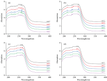 图4是不同榨油温度下核桃蛋白组分的紫外光谱图。 蛋白质的紫外吸收强度和其侧链中的氨基酸残基有关。 其中, 疏水性氨基酸基团, 色氨酸(Trp)、 酪氨酸(Tyr)和苯丙氨酸(Phe)残基的暴露直接影响蛋白质的紫外吸收水平, 因此观察其光谱变化也能够反映蛋白质的构象变化。 虽然, 非疏水性的组氨酸和半胱氨酸对紫外吸收也有影响, 但其产生的影响没有以上3种氨基酸产生的影响大。 核桃四种蛋白组分在275 nm附近波长处都表现出明显的紫外吸收, 随着榨油温度的增加, 清蛋白、 球蛋白、 醇溶蛋白和谷蛋白的峰强度变化不大, 但清蛋白和球蛋白的紫外吸收峰个数多于醇溶蛋白和谷蛋白, 说明清蛋白和球蛋白含有更多暴露的疏水性基团, 该结果与前面讨论的荧光光谱峰强度与疏水基团暴露情况所得出的结论一致。