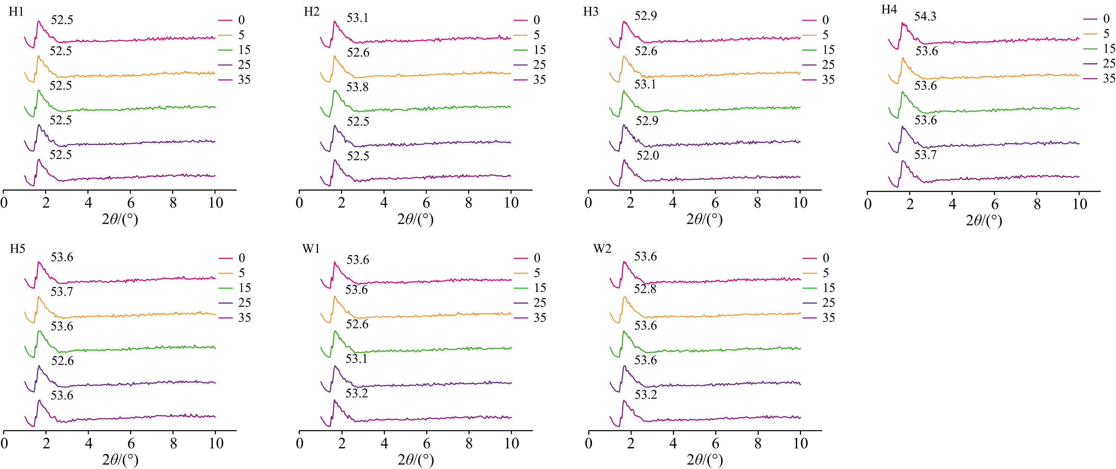 脂肪同质多晶行为一般是通过晶体的同质多晶来体现, X射线衍射(XRD)的长间距和短间距可以确定脂质的晶体堆积方式和晶体形态。 如图1所示, 图1为短间距(10° < θ < 30° )图谱可提供晶型信息, 图2为长间距(2° < θ < 10° )图谱, 可提供链长结构信息。 脂肪典型晶型结构主要有α 、 β '和β 三种晶型, 三种晶型的熔融特性与同质多晶行为也存在较大差异, α 晶体的热稳定性、 熔点均较低, 且可迅速转变β '和β 晶型。 β 晶体的稳定性与熔点均较高, 易形成致密粗大的片状晶体, 其包裹液油的能力不如β '晶型。 β '晶型稳定性介于α 晶型和β 晶型之间, 晶粒细腻、 呈细针状, 常用于奶油和起酥油等乳基产品中提供理想可塑性、 涂抹性及口感。 晶型是可以表示时间和温度的函数, 可以看出晶型由不太稳定的形式转变为更稳定的形式。 α 晶型的特征短间距为4.15 Å ; β '晶型的特征短间距为 4.2和 3.8 Å [12]; 而β 晶体形式表现出 4.6 Å 的特征短间距[13]。 由图可知, 所有的奶油样品脂质晶体都不具α 晶型, 大部分脂质都只具有β '晶型, H5具有β 晶型, H2、 H3、 H4在温度升高后呈现出β 晶型特征。