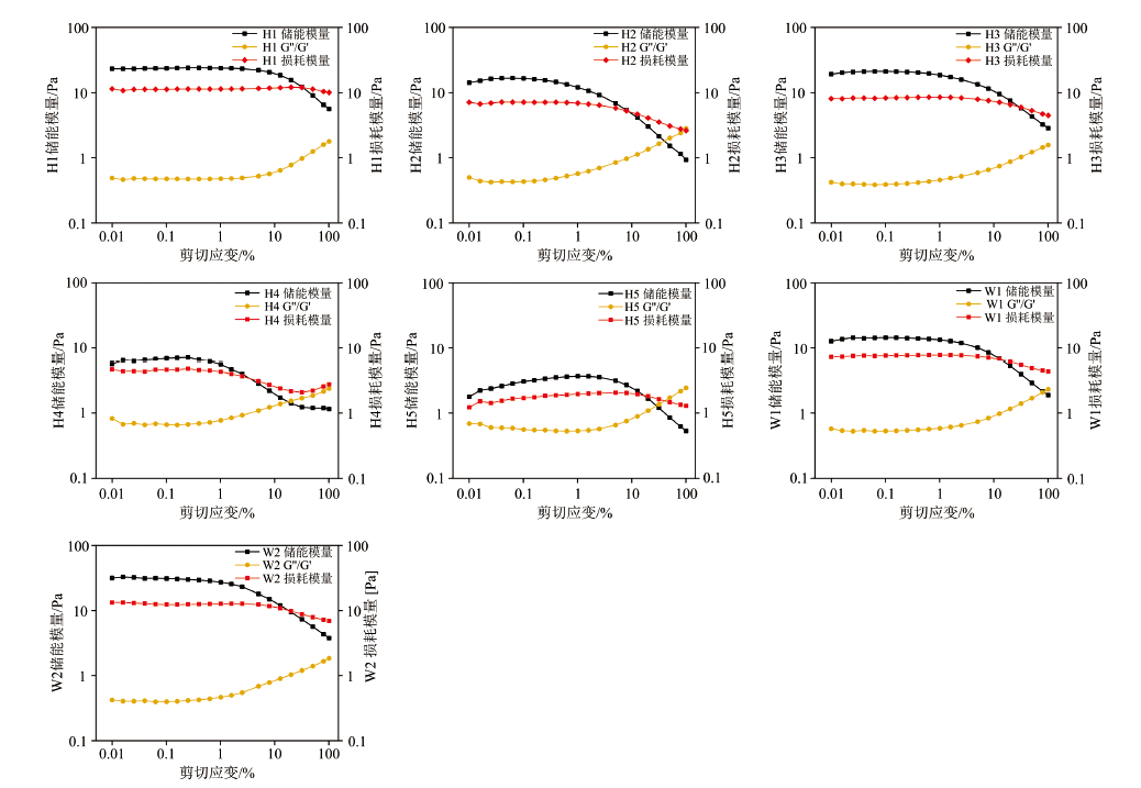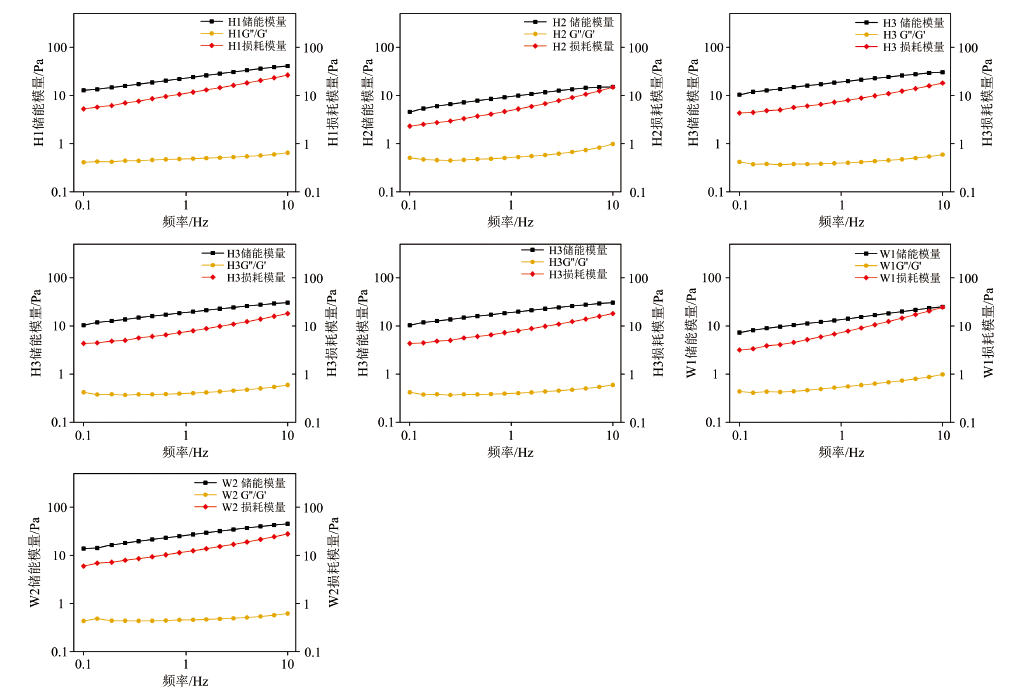 动态振幅扫描, 测定线性粘弹性区, 在1 Hz频率下, 在0.01%~100%的应变范围内进行应变扫描获得剪切模量。 在0.1~10 Hz的频率范围内进行频率扫描, 固定应变为0.1%。