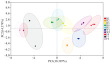 主成分分析(PCA)是一种多变量统计分析方法, 可用于解析样品间挥发性有机化合物组成的差异, 并评估样品间的分类规律及变异特征[26]。 在PCA分析中, 香气特征相似的样品通常在得分图中聚集或重叠, 而香气组成差异较大的样品则会相互分离[27]。 通过PCA对不同脂质组成搅打奶油样品中挥发性有机化合物的分析, 可揭示脂质组成对风味成分的影响, 并进一步探讨二者之间的关联性[28]。 乳脂奶油样品与乳/植脂混合奶油样品和植脂奶油样品之间的分布较分散, 说明不同脂质组成之间风味差异较大, 乳/植脂混合奶油与植脂奶油产品之间风味差异较小, 由图8可看出, 乳/植脂混合奶油样品H3、 H4、 H5中风味物质之间差异较小, 结合图7 中对搅打奶油样品中挥发性有机化合物相对含量进行分析, 说明在三个样品中含有的挥发性有机化合物组成相似, 如庚酮、 戊酮、 丙酮等部分有机化合物含量相似, 风味相近; 三种乳脂奶油样品之间的主要挥发性有机化合物的含量相近, 在图8中分布较为接近, 风味差异较小, 风味较为相似。