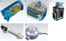 高光谱辐射观测系统中的核心仪器是光谱辐射计, 是国家公益性行业(气象)专项的自主研发的仪器成果, 分为半球接收型和定向接收型2类不同接收特性的仪器, 分别采用了不同的外壳封装结构设计, 图2(a)— (c)分别给出了光谱辐射计的设计效果。 半球接收型光谱辐射计的前端是具有均匀散射特性的余弦校正器, 通过光纤引入光谱仪, 用于观测。 定向接收型光谱辐射计的光纤前端则是由Gershun管(光阑筒)结构的窄视场光筒, 根据世界气象组织(WMO)推荐采用5° 的视场角, 用于观测。