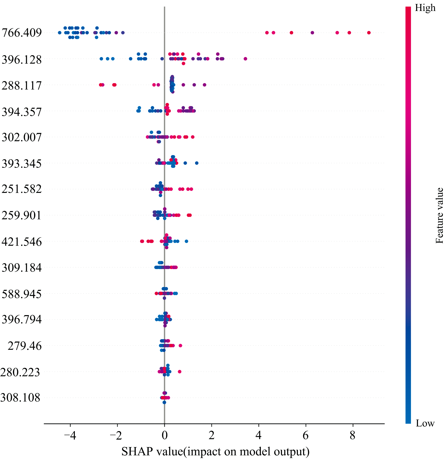 本研究利用主成分分析(principal component analysis, PCA)进行二次降维, 保留95%的累积方差贡献率后, 利用XGBoost模型计算每个波长对应的SHAP(shapley additive explanations)值。 通过求取各特征在所有样本上的平均绝对SHAP值, 筛选出前15个权重最高的波长, 如图4所示。 其中红色代表高特征值, 蓝色代表低特征值, 颜色越深, 表示该特征值对当前样本的SHAP值影响越显著。 最顶部的特征对模型预测影响最大, 其SHAP值的分布范围较广, 说明该特征在不同样本中的影响差异显著。