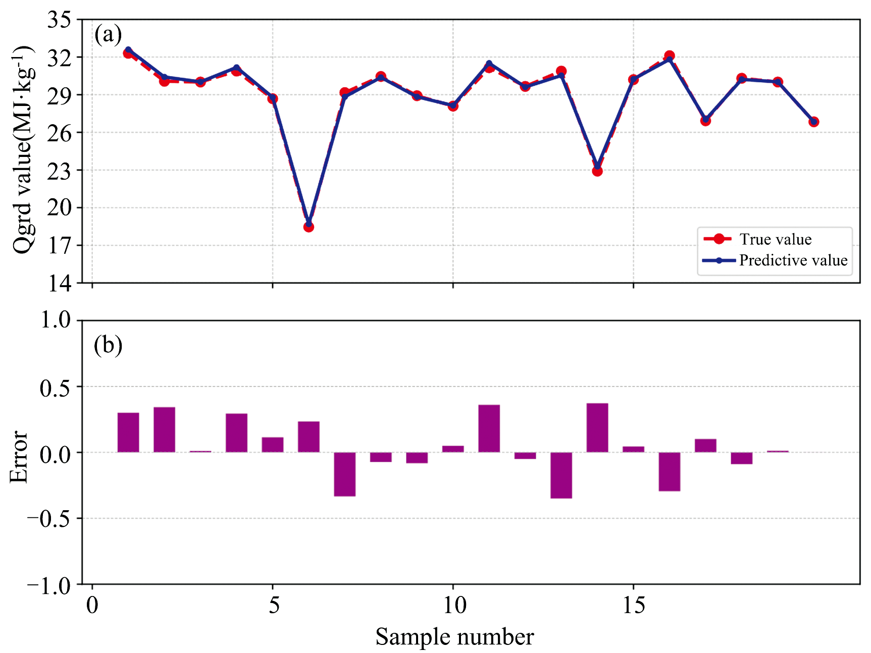 鲁棒性反映了检测系统在复杂工况下持续输出高精度结果的能力, 其核心体现在对未参与建模样本的参数预测准确性及长期稳定性方面。 工业场景中, 检测仪器需克服环境扰动与操作变量引入的系统误差, 而高性能软硬件协同架构可有效抑制系统漂移, 提升对异常工况的容忍阈值。 为验证本设备的工业鲁棒性, 采用20组未参与建模的煤炭样本进行外部验证。 这20组样品来自某燃煤铜冶炼厂, 通过现场实际生产过程中皮带物料进行跨带式在线检测, 通过化验室送检得到灰分与热值浓度后进行比对, 能够代表实际使用场景。 将GA-XGBoost模型应用于这20个样品的光谱数据, 比较预测灰分、 热值与标准值之间的偏差如图7(a)与图8(a)所示, 灰分与热值的预测值与真实值高度吻合, 最大绝对偏差分别小于1%和0.5 MJ· kg-1; 图7(b)与图8(b)进一步展示了各样本的误差分布, 灰分预测误差集中在± 0.9%范围内, 热值误差波动幅度低于± 0.35 MJ· kg-1, 且无明显系统性偏移。 实验结果表明, GA-XGBoost模型在复杂工业场景下仍能保持高精度与稳定性, 其误差水平能够满足燃煤铜冶炼厂在线监测的实时性需求[20]。 该模型的可靠性能为燃料配比优化、 燃烧效率提升及环保调控提供精准数据支撑, 从而降低设备损耗并减少碳排放。