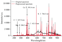为了进一步提升定量分析的准确性, 并防止模型出现过拟合, 本文对原始光谱数据进行了多项预处理操作。 首先, 在光谱数据的背底校正方面, 采用了自适应迭代重加权惩罚最小二乘法(adaptive Iteratively reweighted penalized least squares, airPLS)。 通过最小化背景信号的平方误差, 准确估算并去除光谱中的背底, 其中窗口大小设置成5, 惩罚系数为0.1, 最大迭代次数为200。 该算法的优势在于其能够根据光谱的局部特征自适应地调整背底形状, 无需对背底进行先验假设。 通过这种方法, 可以有效去除光谱中的背底漂移, 并保留光谱中元素的特征信息, 从而确保后续分析的精度。 经过背底校正后, 对光谱数据进一步进行了S-G平滑去噪, 以减少高频噪声的干扰, 其中窗口大小设置为5, 多项式阶数设置成3, 并对数据进行了光谱识别及谱峰的提取。 基线校正与去噪前后的平均光谱如图3所示。