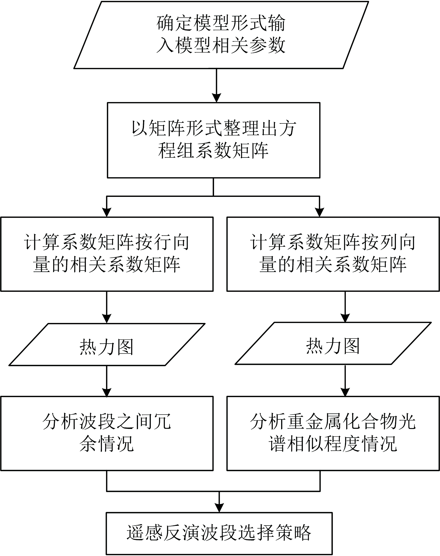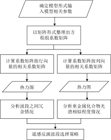 若不满足解的合理性, 则按照相关系数由大至小原则, 减少化合物种类或波段数目。 只要化合物种类和波段数目二者之一发生了改变, 都需要重新分别计算出新的系数矩阵按行(即按波段)和按列(即按重金属化合物种类)的相关系数矩阵。 然后, 重新回到第一步, 周而复始。
