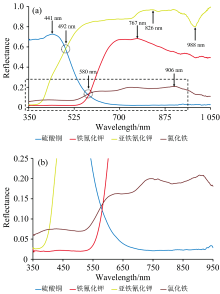 此外, 留意这四种化合物反射率光谱的两个“ 交点” 位置。 波长位置1: 硫酸铜和亚铁氰化钾在波长492 nm相交(反射率为58%); 波长位置2: 硫酸铜、 氯化铁、 铁氰化钾三者相交于在波长范围576~584 nm(中心波长580 nm, 位于绿光波段), 反射率为13%~14%。
