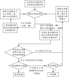 当遥感模型按式(2)的矩阵形式整理完毕后, 第一步, 按化合物种类最大数目和所有联立方程组的方程最大数目, 先分别计算出初始相关系数矩阵。 若此时, 方程组系数矩阵在此情况下, 化合物彼此的相关系数已处于较低, 例如均不大于预设的相关系数阈值rm。 那么可直接进行下一个环节: 判断方程组类型。