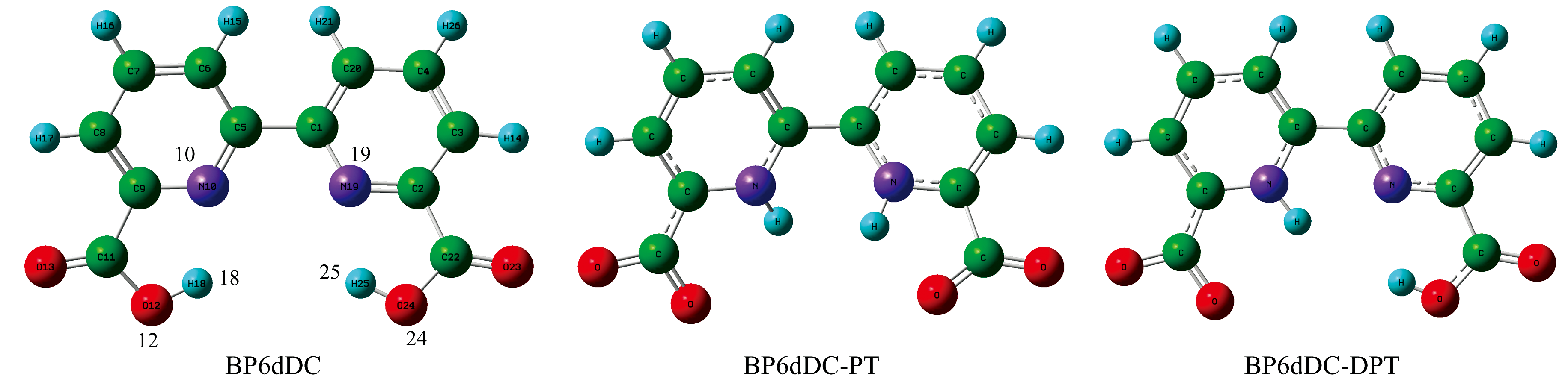 | 图3 BP6DC, BP6DC-PT和BP6DC-DPT结构 紫色: N; 红色: O; 蓝色: HFig.3 BP6DC, BP6DC-PT and BP6DC-DPT structures purple: N; red: O; blue: H |