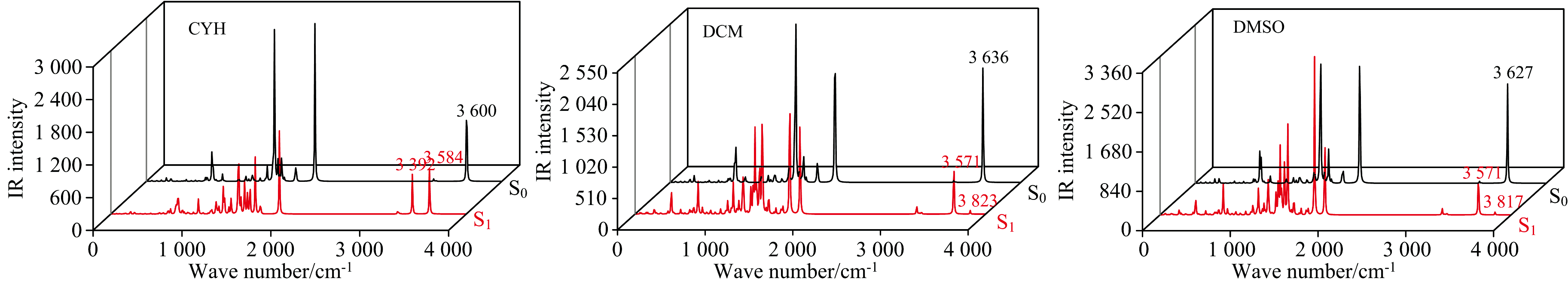 红外光谱的变化情况同样可以证明氢键的增强或减弱情况[38]。 因此在这一节中我们利用同样的方法模拟了BP6DC在CYH, DCM和DMSO溶剂中的红外光谱。 我们分别计算了S0态和S1态时的红外光谱, 观察到了与上一节的氢键参数一致的变化规律。 如图4所示, 在CYH溶剂中, S0态下的BP6DC在振动波数为3 600 cm-1处存在O12— H18和O24— H25同时的伸缩振动, 而S1态下在3 392 cm-1处出现O12— H18键单独的伸缩振动, 与S0态相比频率红移了208 cm-1。 同样在S1态下, O24— H25键在3 584 cm-1处出现了伸缩振动, 其频率与S0态相比仅仅红移了16 cm-1。 这表明, 在S1态下, CYH使BP6DC的氢键得到了增强。 在DCM溶剂中, 基态的BP6DC在3 636 cm-1处存在O12— H18 键和O24— H25键协同拉伸振动。 而在激发态下, 分成两个峰, 分别红移到3 571 cm-1和蓝移到3 823 cm-1处。 类似的, DMSO溶剂中, BP6DC分子在基态时, 振动波数为3 627 cm-1处也出现O12— H18键和O24— H25 键协同拉伸振动。 同样在S1态时被分成两个单独的峰, 振动波数分别红移到3 571 cm-1和蓝移到3 817 cm-1。 我们发现随着溶剂极性的增强, O12— H18键在S1态的伸缩振动的波数红移程度在减小, 如CYH(208 cm-1)→ DCM(65 cm-1)→ DMSO(56 cm-1)。 说明溶剂极性影响氢键在激发态下的增强程度。