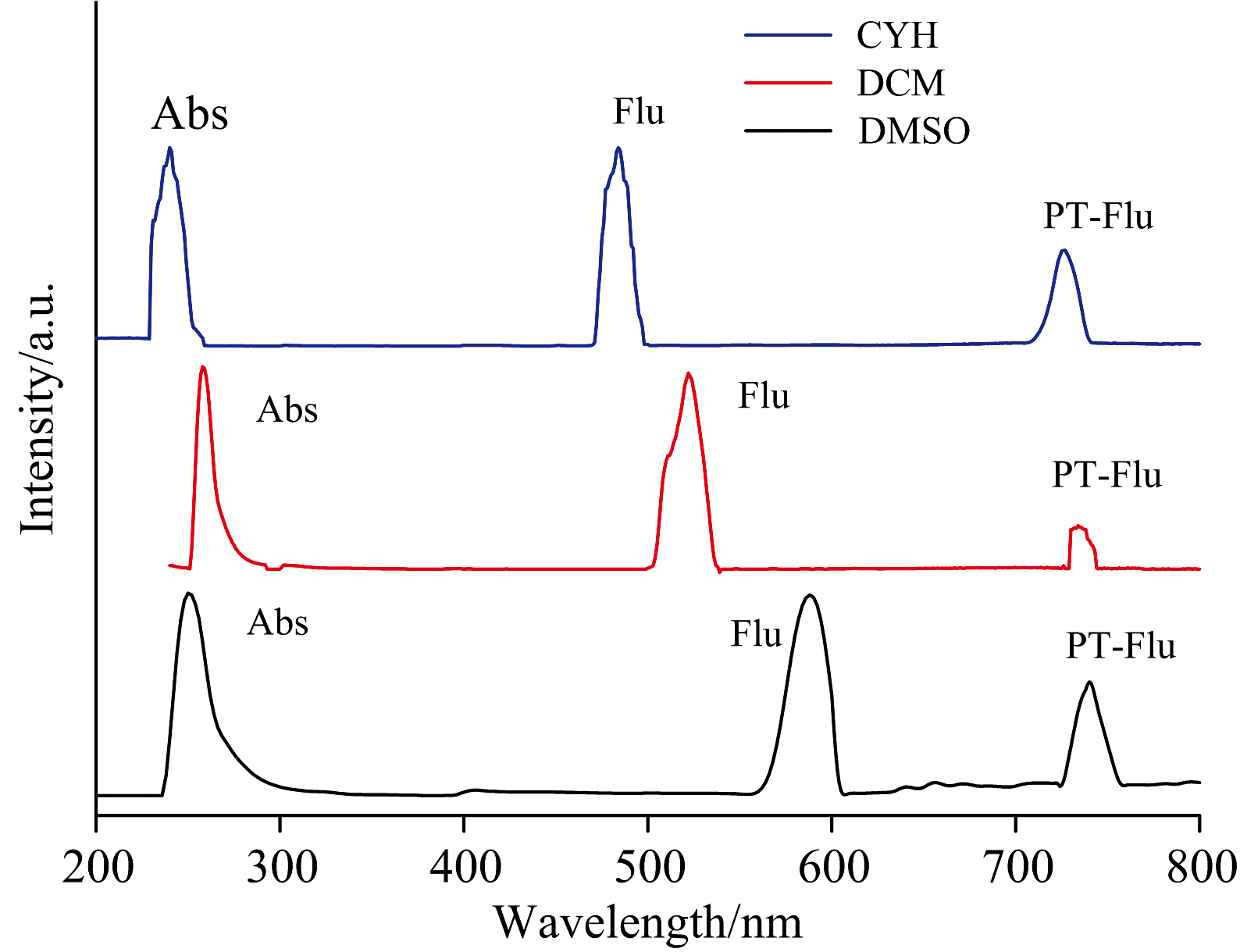 测定了BP6DC在低极性CYH, 中极性DCM和极性较大的溶剂DMSO中的稳态吸收光谱与荧光光谱, 如图6所示。 BP6DC在三种溶剂中归一化的吸收峰的位置分别在247、 260和240 nm, 在三种溶剂中吸收峰的位置没有明显的差异。 实验所得的结果与计算所得的电子吸收谱非常吻合, 说明我们所选的基组是比较准确的。 测量荧光光谱时我们发现了两个尖峰, 先前的研究表明这两个峰中一个是烯醇态发射出来的, 另一个峰则是酮态发射出来的。 如图6所示, 在CYH溶剂中, 247 nm是测得的吸收峰, 585 nm处的发射峰是BP6DC的烯醇式构型的荧光峰, 740 nm的荧光峰则是来自于BP6DC-PT(酮式构型)。 另外可以发现BP6DC的烯醇式和酮式构型都发生了斯托克斯位移。 因此我们有理由推测, 烯醇式BP6DC通过吸收光子发生ESIPT过程, 转化为相应的BP6DC-PT。 其余两种溶剂也出现类似的现象, 他们出现的两个发射峰同样来自于BP6DC和BP6DC-PT转化过程中存在的较大的斯托克斯位移。 最后我们发现随着溶剂极性的增强, BP6DC-PT发射峰出现蓝移。 到此我们证实BP6DC的ESIPT机制可以通过溶剂极性来调控。