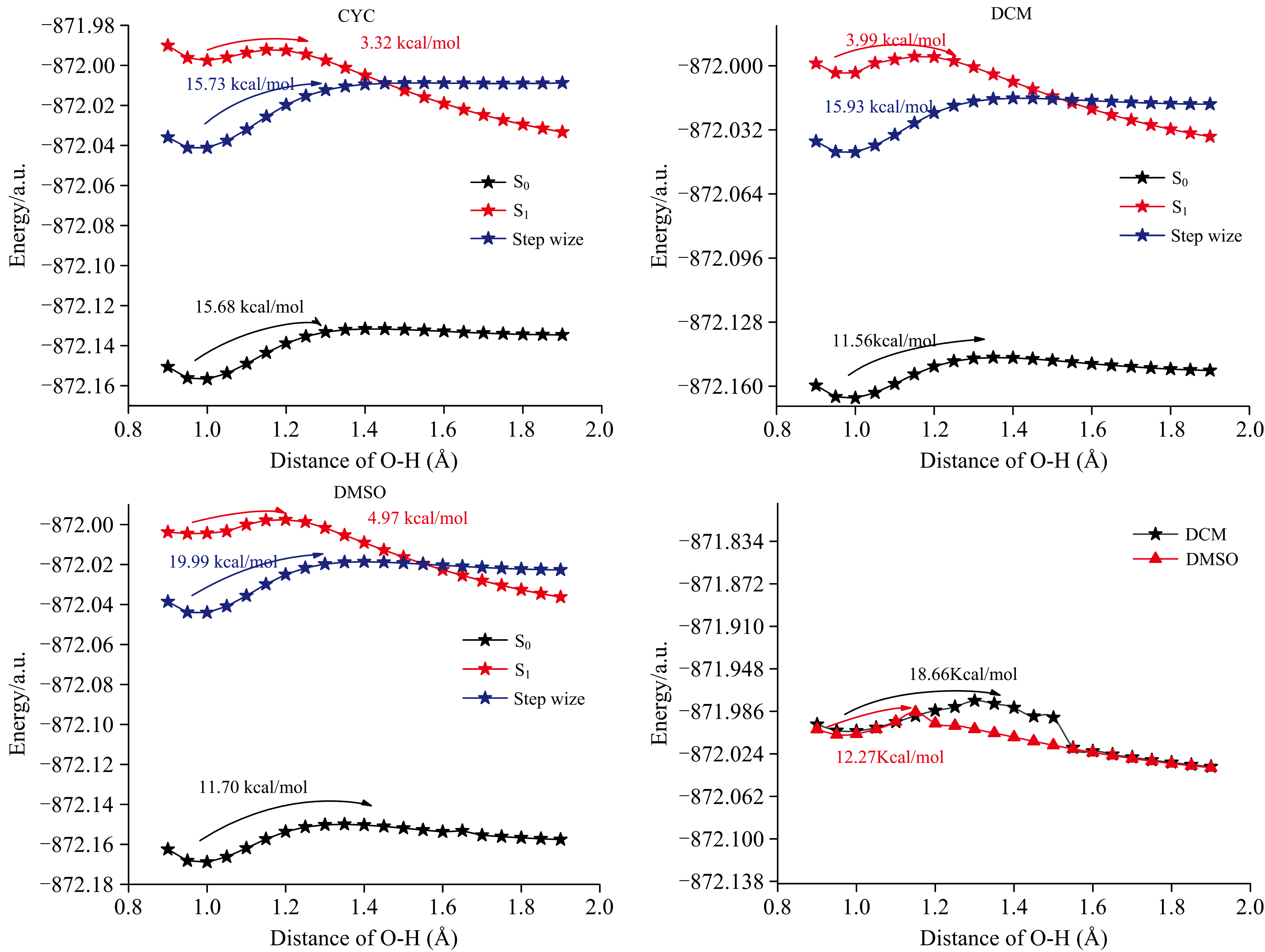 我们使用相同的计算方法和步骤增量对O24— H25键的势垒进行了扫描。 结果显示, 二氯甲烷(DCM)的势垒高度为12.27 Kcal· mol-1, 二甲基亚砜(DMSO)的势垒高度为18.66 Kcal· mol-1。 基于这些发现, 我们得出结论, 在DCM和DMSO溶剂中, 单向的ESIPT是可行的。 这一结论强调了溶剂对激发态质子转移过程的方向性和可行性的影响。