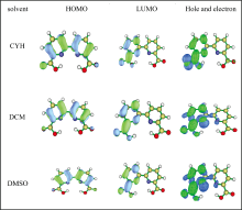 | 表4 PB6DC在CYH, DCM和DMSO溶剂中的空穴和电子质心距离(D), 空穴-电子的重叠函数(Sr)和空穴-电子分离函数(t) Table 4 Hole-electron centroid distance (D), hole-electron overlap function (Sr) and hole-electron separation function (t) of PB6DC in CYH, DCM and DMSO solvents |