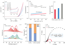 随后, 我们测试了CoIrOx催化剂在pH 1的硫酸中的析氧反应活性。 从图2(a)可以看出, CoIrOx性能和稳定性都远超于商业化的IrO2, 并且随着循环次数的增加, 催化剂的性能越来越好。 除此之外, 位于1.05/1.0和1.35/1.4 V两处分别对应于Ir3+/Ir4+和Ir4+/Ir5+的氧化还原峰也逐渐明显, 且非法拉第电容区变宽, 这表示随着测试时间的延长, 催化剂的电化学比表面积(ECSA)逐渐增大, 循环后的ECSA接近于之前的1.5倍, 我们猜测这可能由于Co在酸性环境下浸出, 催化剂表面有更多的Ir位点暴露, 导致最终性能的提升。 从图2(b)和(c)中可以看出Co浸出后的催化剂拥有三者中最小的Tafel斜率和过电位(10 mA· cm-2电流密度下), 表明浸出后的CoIrOx催化剂的动力学最快, 性能最好。