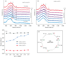 由电化学性能测试结果可知, CoIrOx的电催化OER过程可以分成三个阶段。 施加电压之后, 0.9~1.2 V范围内, 大多数的Ir3+转变为Ir4+。 随后在1.35 V被继续氧化为Ir5+活性中间体, 最终催化OER过程的发生。 在对应的原位SERS光谱中, 也可以观察到同样的趋势。 如图3(b)所示, 在开路电压下, 可以观察到三个比较明显的峰, 位于620 cm-1 的δ 峰归属于Ir3+的Ir— O键的伸缩振动, 而位于510和750 cm-1的γ 和ε 两个峰归属于四价Ir4+的Ir— O键的伸缩振动[15]。 随着电压的升高, 这δ 和ε 两个峰在1.25 V逐渐消失并伴随着β 、 θ 和η 三个峰的出现, 这表示Ir位点的氧化进入了下一阶段。 根据文献报道, β 和θ 两个峰分别对应于Ir5+的Ir— O键的弯曲振动和伸缩振动, 而对于η 峰的归属, Pavlovic等[16]通过DFT计算的方式, 将位于829 cm-1处的η 峰归属于活性中间体Ir=O的伸缩振动, 同时Alexander J Cowan等[17]使用氘代的电解液进行原位测试, 该峰位置并没有发生明显的移动, 说明这一振动模式不太可能是质子化的氢氧化物或过氧化物, 因此将η 峰归属于高价Ir5+的Ir— O的伸缩振动。 除上面所述的这几个峰之外, 在电压升到1.45 V时, 580 cm-1处出现了一个较强的振动峰, 图中标记为“ * ” , 这与文献中金红石IrO2在563 cm-1处的峰相近, 可能由于催化剂在OER过程中生成了不同相的氧化铱。 最后, 我们将上述峰位置和峰的归属总结在表1中。