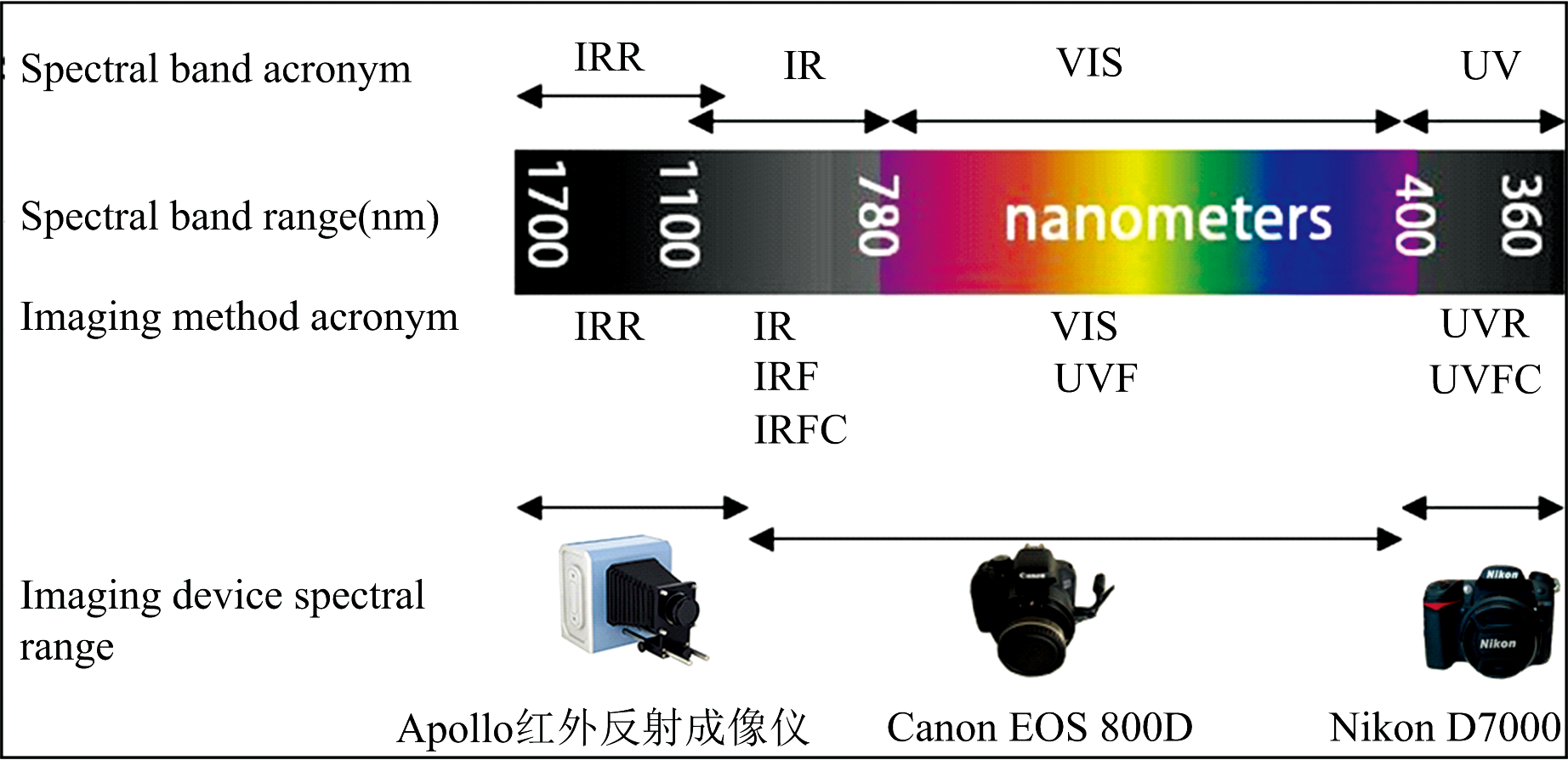 (1)多光谱摄影技术: 使用多个成品或者改造后的商用光学相机搭建一套涵盖紫外-可见-红外光波段的多光谱摄影系统(设备参数见表1)。 本研究所用光谱带、 成像方法和成像设备示意图见图2。 本文所涉及的成像方法、 图像处理专业名词及其英文缩略语包括紫外荧光成像(UVF Photography)、 可见光反射成像(VIS Photography)、 红外反射成像(根据成像设备差异分为IR Photography和IRR Photography)。 其中, 紫外荧光成像图、 红外反射成像图又可分别和可见光反射成像图通过数字拟合成具有材料鉴别功能的紫外假色图(UVFC)和红外假色图(IRFC)[6]。