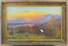 综合运用以上技术对整幅油画进行分析: 从红外假彩色图来看, 整幅画面透出玫红色的底色, 可见光下这种底色对应为蓝色或者蓝灰色, 经综合分析推测, 这种暗色底色的主要呈色颜料为钴绿和铬绿调和而成。 通过其他多处笔触、 色彩的叠压关系来看, 推断作者先运用这种较为统一的暗色颜料进行大面积铺底, 接着再用其他颜料混色进行深入塑造, 按照焦点透视原则绘制落日、 河流、 远山和草木, 最后刻画细节以丰富画面。 远景天空处的云朵在可见光照片中呈现为统一的蓝灰色, 但在红外伪彩图中可明显看出其由两种不同的颜色成分构成, 并且作者干扫的笔触变得清晰明朗, 可见, 此处画面的层次是作者通过两种微妙的蓝灰色干扫过渡表现出来的。 近景的树丛边缘, 在原作中呈现为统一的淡紫红色, 但在红外假色照片中, 可以看到些许蓝色的摆笔或点扫的笔迹, 推测为作者在描绘中部的树丛边缘时, 进行了反复的叠压修改, 调整树丛的轮廓。 为表示秋天丰富的色彩颜色, 作者至少运用铁红、 铬红、 镉红/黄绘制了红色树叶; 运用铁黄、 镉黄描绘了黄色树叶; 运用钴绿、 铬绿(翠绿色)绘制绿色树叶; 运用钴绿调和浅色颜料绘制成天空; 运用镉红、 铁黄等调和绘制成了夕阳和余辉, 钴蓝和铬绿调和绘制成暗色云层, 丰富了天空的色彩层次; 多种颜料被无序地用于草地的绘制。 总体来看, 整幅画面构图严谨完整, 笔触变化显著, 色彩和谐、 自然写实、 富有力量感, 即给人视觉上的享受, 又在情感上也给人以深刻的共鸣。