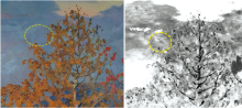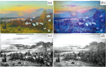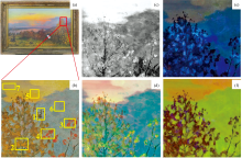 (2)通过多光谱摄影技术检测得出: 油画《德涅伯尔河的秋天》无整体涂刷光油, 但通过紫外荧光成像结果推测在画面的中下半部作者运用较多的调和油进行局部涂刷; 多波段红外光谱摄影未发现油画有底稿层。