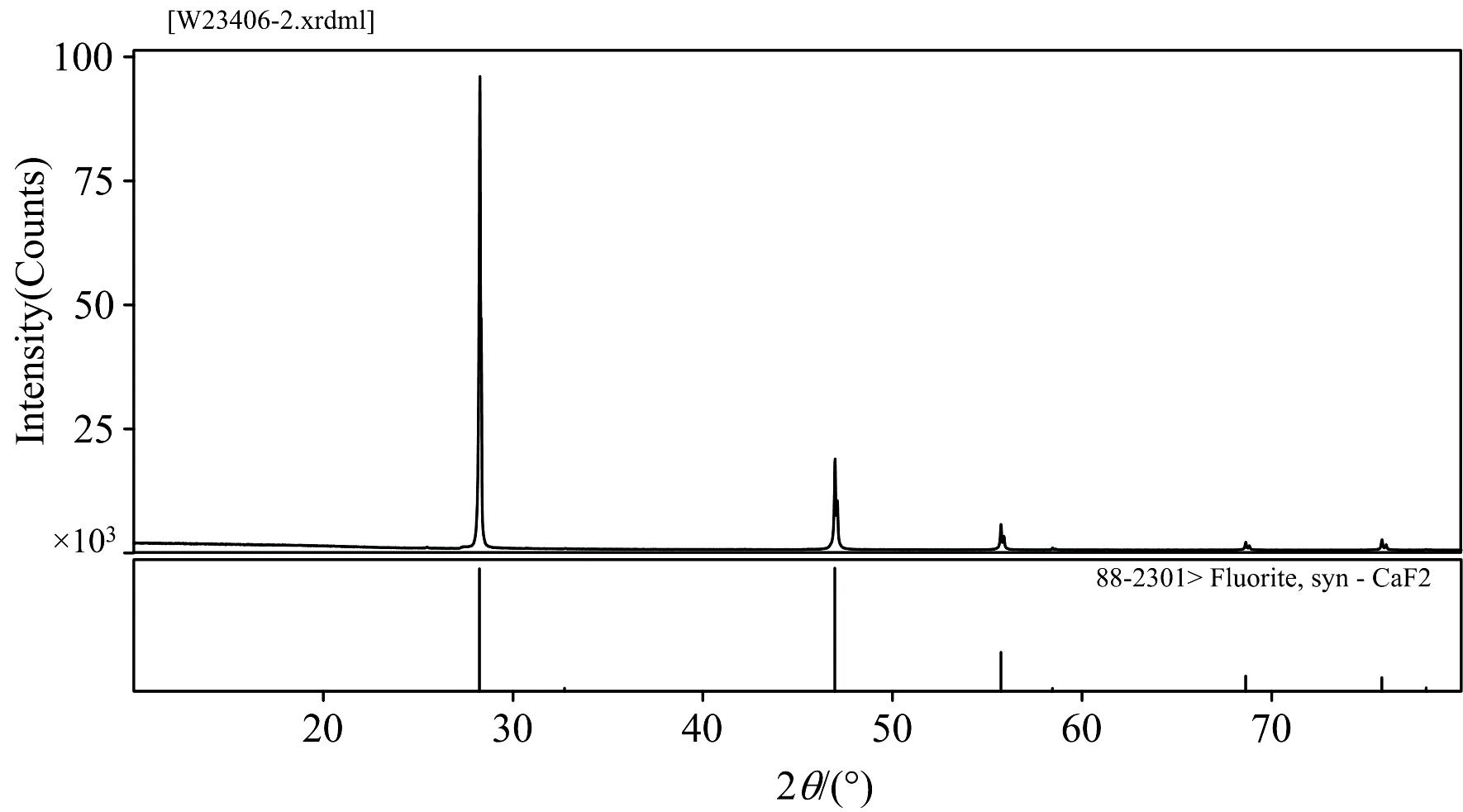 萤石纯矿物取自白云鄂博萤石矿床, 为浅紫色透明的萤石块状晶体, 制备方式为: 在矿山挑选出的含萤石晶体的大块矿敲碎后, 经过弱磁、 强磁、 摇床重选、 人工淘洗等方法, 得到高纯度的单矿物, 再将萤石晶体中结晶好的选出来, 通过显微镜, 我们成功提取了萤石的高纯度矿物。 采用玛瑙研磨机对矿物进行研磨, 经过精细的干筛分离, 这些颗粒被妥善存放于宽口瓶中, 以便于后续实验的使用。 部分矿样经过玛瑙研钵的进一步细磨, 制得-5 μ m的颗粒样品, 以供FTIR和XPS分析使用。 萤石的XRD谱图见图1, 从图1可以看出, 萤石的XRD峰与标准卡片的峰高完全一致, 未见杂峰, 充分证明了所用萤石的高纯度。 表1中显示, 萤石样品的钙含量高达51.12%, 氟含量为48.48%, 这一系列数据表明, 所有试验所用的萤石纯矿物样品的纯度均超过95%, 完全符合检测标准, 且与理论计算的钙和氟含量相吻合。