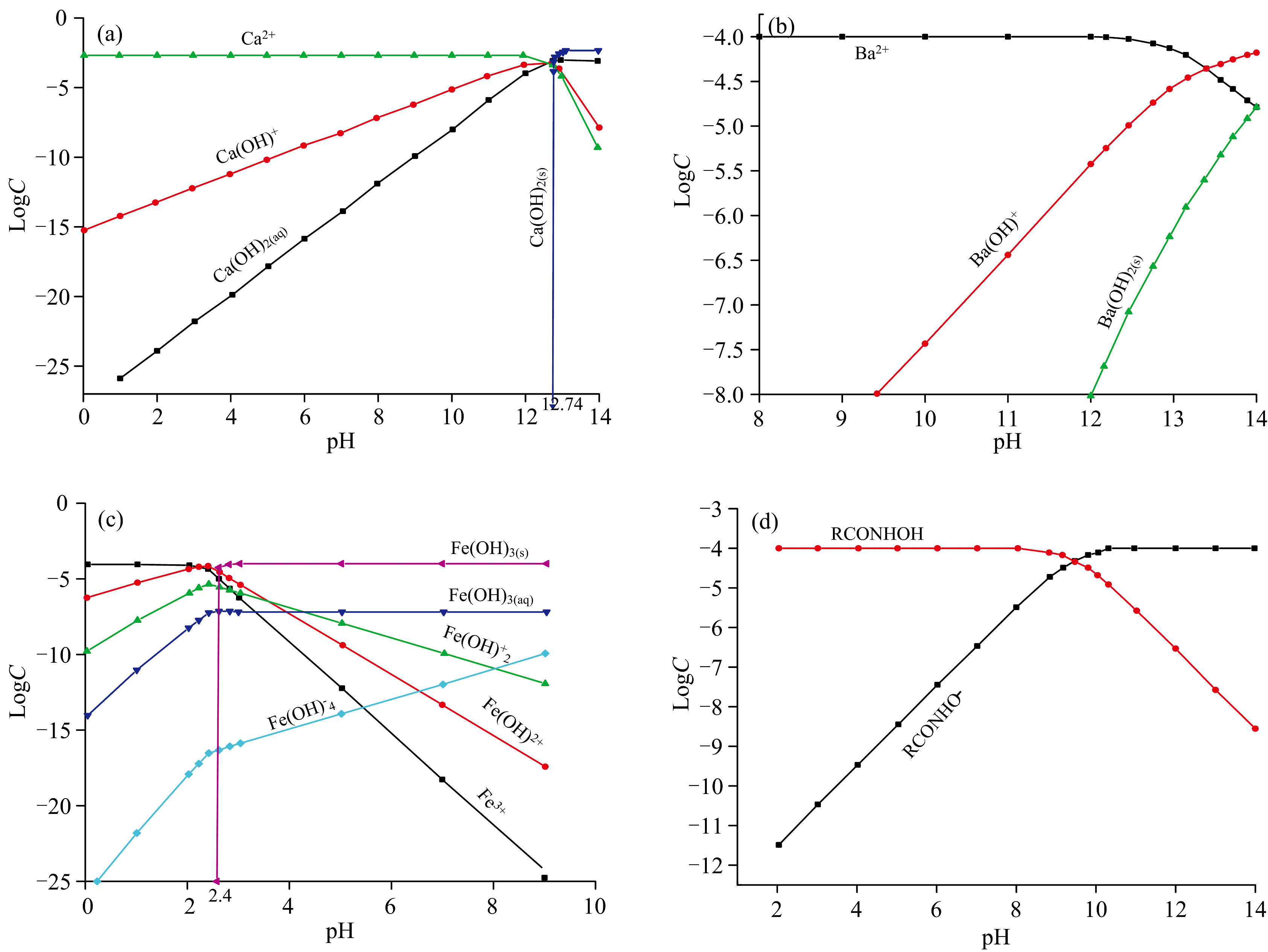 根据Ca2+的性质可知, 其溶液中可生成沉淀氢氧化钙, 因此Ca2+在溶液中存在均相和多项体系两种体系平衡, 已知Ca2+浓度c=2× 10-4 mol· L-1, Ba2+浓度c=2× 10-4 mol· L-1, Fe3+浓度c=1× 10-4 mol· L-1, OHA浓度c=1× 10-4 mol· L-1, 金属离子在水作用后形成各种羟基络合物, OHA捕收剂在水溶液作用后, 形成OHA分子形态和离子形态, 通过溶液平衡关系可以得出各种组分的浓度。