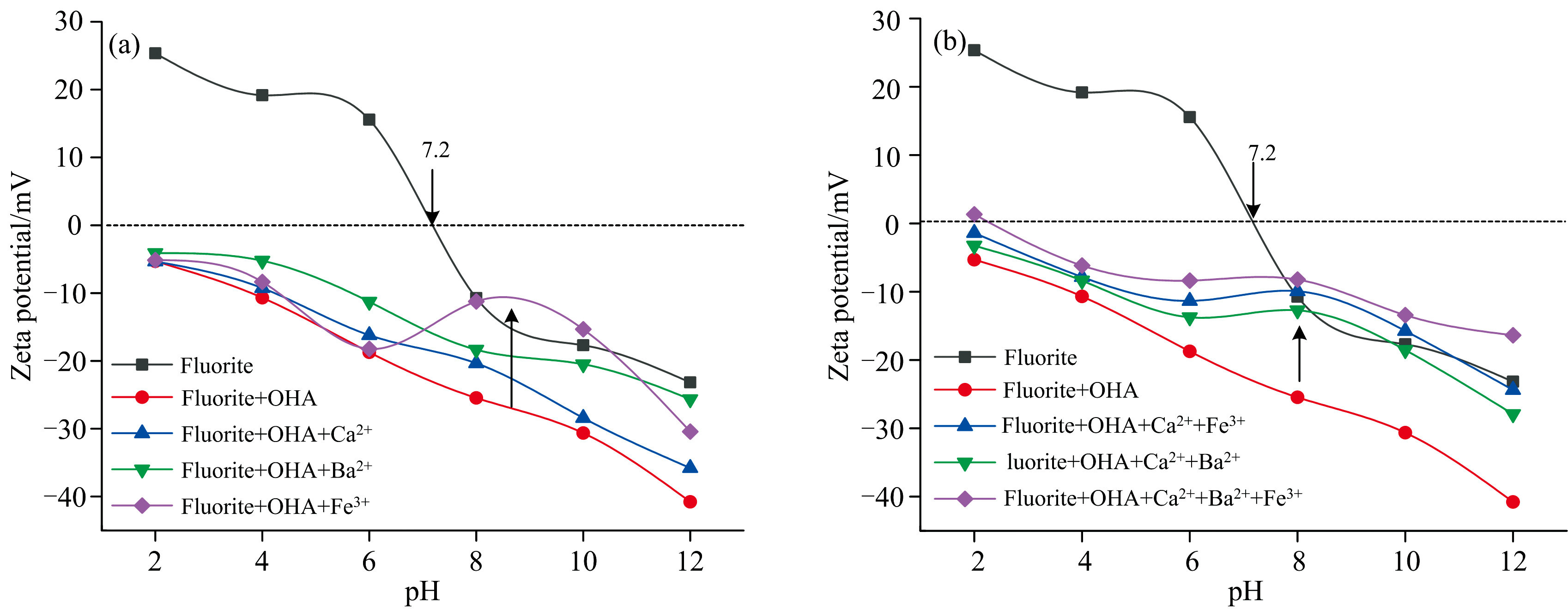 | 图3 金属离子对萤石表面zeta电位的影响 (a): 单一金属离子; (b): 混合金属离子Fig.3 The effect of metal ions on the zeta potential of fluorite surface (a): Single metal ions; (b): Mixed metal ions |