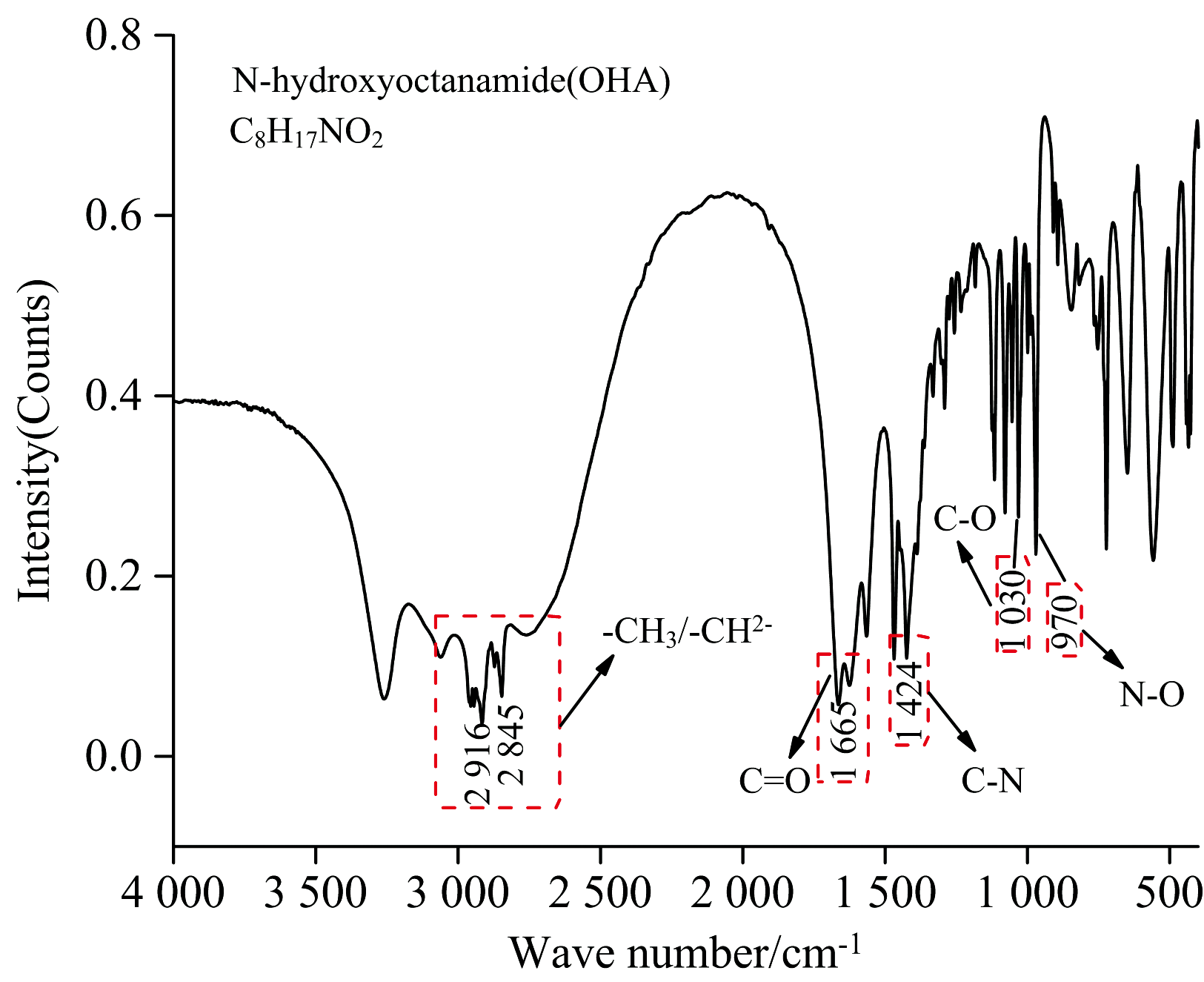 由图4可知, OHA捕收剂的红外光谱中[18], 3 000~2 800 cm-1处出现了OHA的甲基(— CH3)、 亚甲基(— CH2— )的伸缩吸收峰, 1 665 cm-1处出现了C=O伸缩振动吸收峰, 1 424 cm-1处出现了C— N伸缩吸收峰, 1 078 cm-1处出现了C— C— C面内摇摆振动吸收峰, 1 030 cm-1处出现了C— O伸缩振动吸收峰, 970 cm-1处出现了N— O伸缩吸收峰。