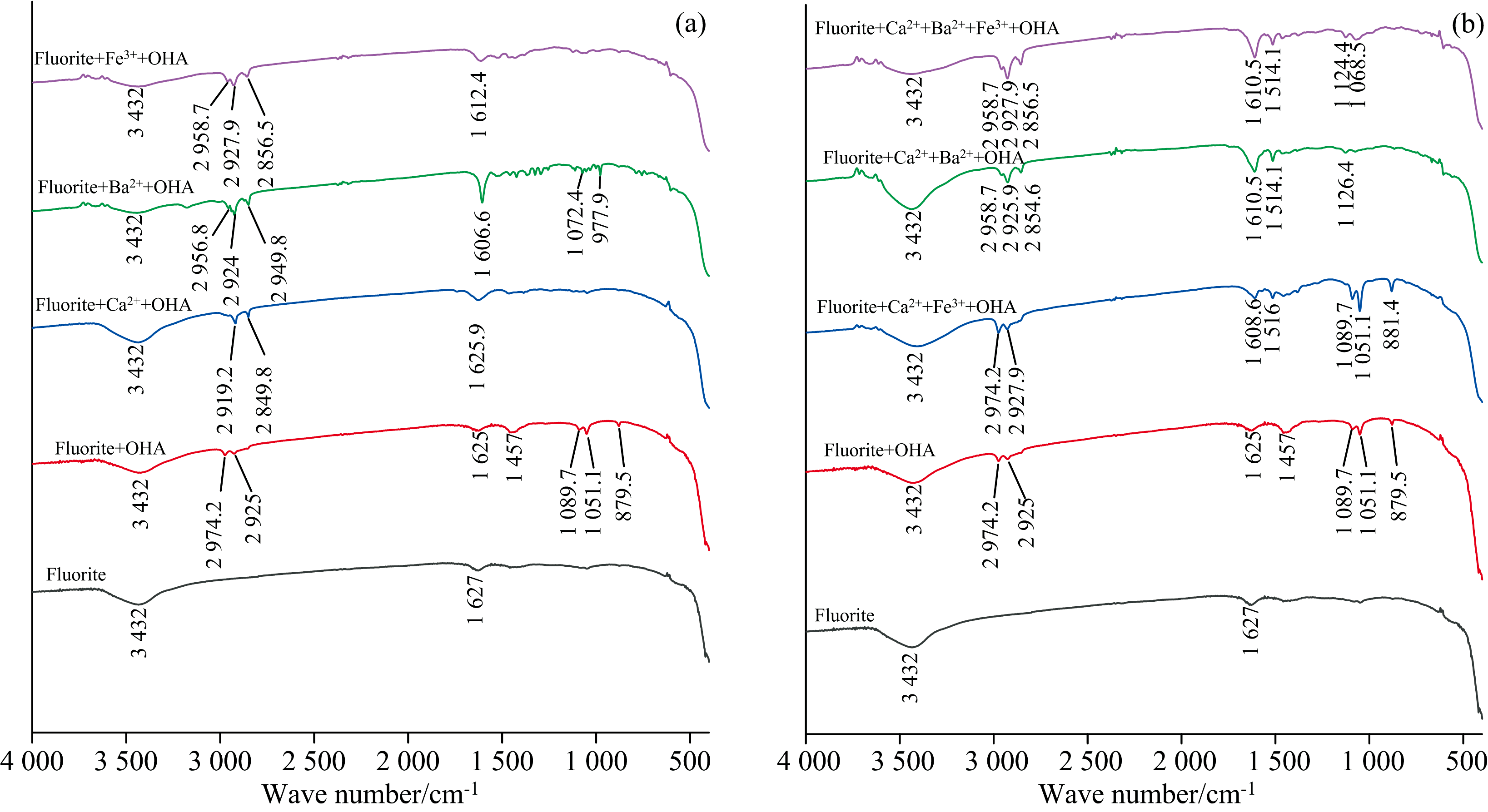 如图5(a)所示, 纯萤石在红外光谱的测定下有两个峰, 在1 627 cm-1处是氟化物的特征峰[18], 在3 432 cm-1处是样品中的水分子的— OH官能团, 此外, 无其他特征峰。 经OHA处理后的萤石出现了多处峰, 在2 974.2和2 925 cm-1处出现了— CH3、 — CH2— 吸收峰, 1 457 cm-1处出现了C— N的吸收峰, 在1 089.7~879.5 cm-1处出现了C— C— C、 C— O、 N— O吸收峰, 均为OHA的特征峰, 说明OHA在萤石表面发生吸附作用。 经Ca2+和OHA处理的萤石, 在2 919.2 和2 849.8 cm-1处出现了— CH3、 — CH2— 吸收峰, 而在其他范围没有出现OHA的特征峰, 但— CH3、 — CH2— 吸收峰有所增强; 在Ba2+和OHA处理的萤石谱图中, 除了出现有机峰, 在1 606.6 cm-1处出现了C=O吸收峰, 在1 072.4和977.9 cm-1处出现了C— C— C和N— O吸收峰, 这些也是OHA的特征峰, 此外, 有机峰出现了比Ca2+处理萤石时有显著的增强; 当Fe3+和OHA处理萤石时, 谱图中出现了有机峰在2 958.7~2 856.5 cm-1, 在1 612.4 cm-1处出现了C=O吸收峰; 分析说明, 金属离子的加入, 影响了萤石吸附OHA, 且吸附强度有所变化, 金属离子对萤石表面吸附OHA的强度大小为Fe3+Ba2+Ca2+。