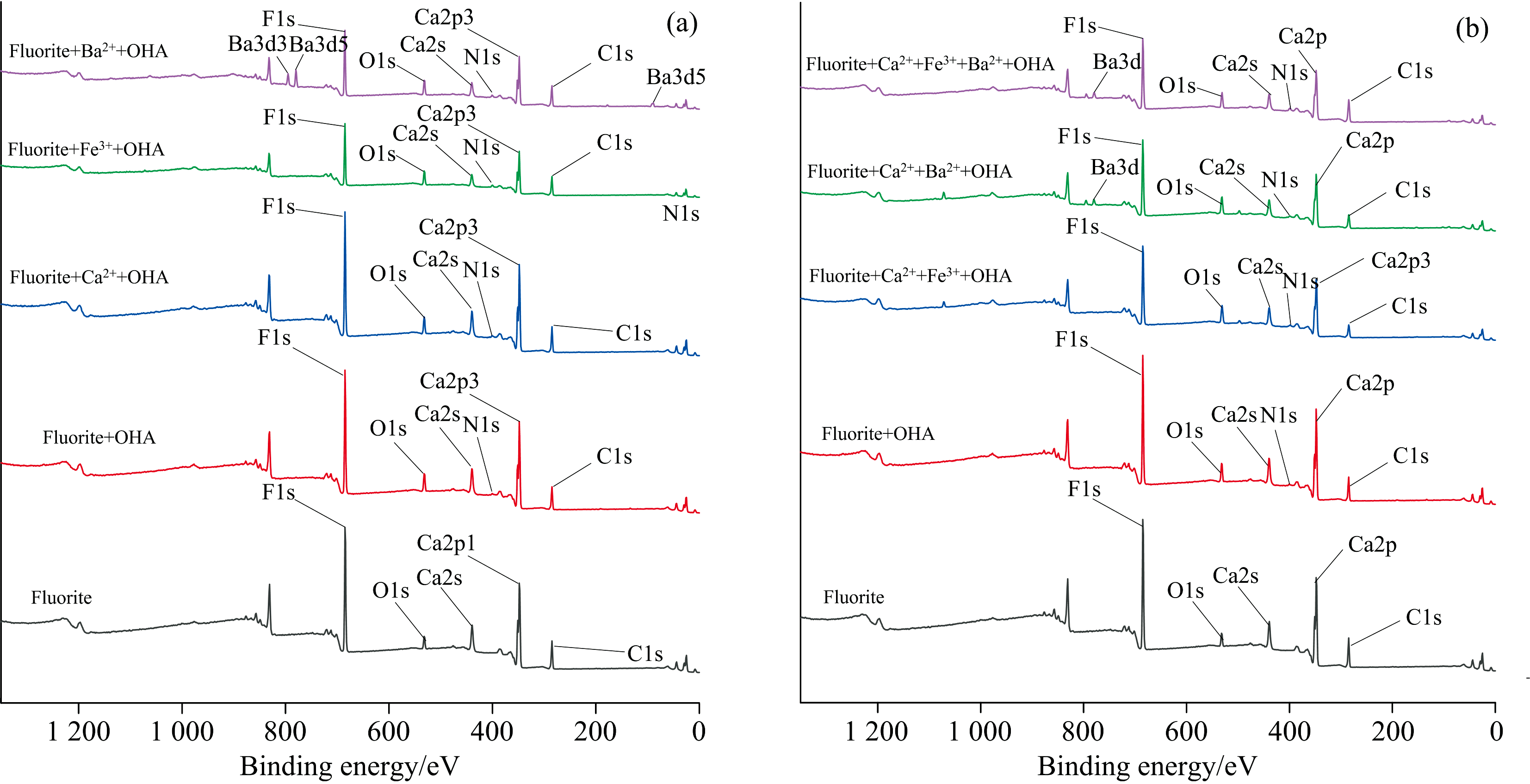 | 图6 金属离子和OHA捕收剂作用前后的萤石XPS全谱图 (a): 单一金属离子; (b): 混合金属离子Fig.6 Full XPS spectra of fluorite before and after the interaction of metal ions and OHA collectors (a): Single metal ions; (b): Mixed metal ions |