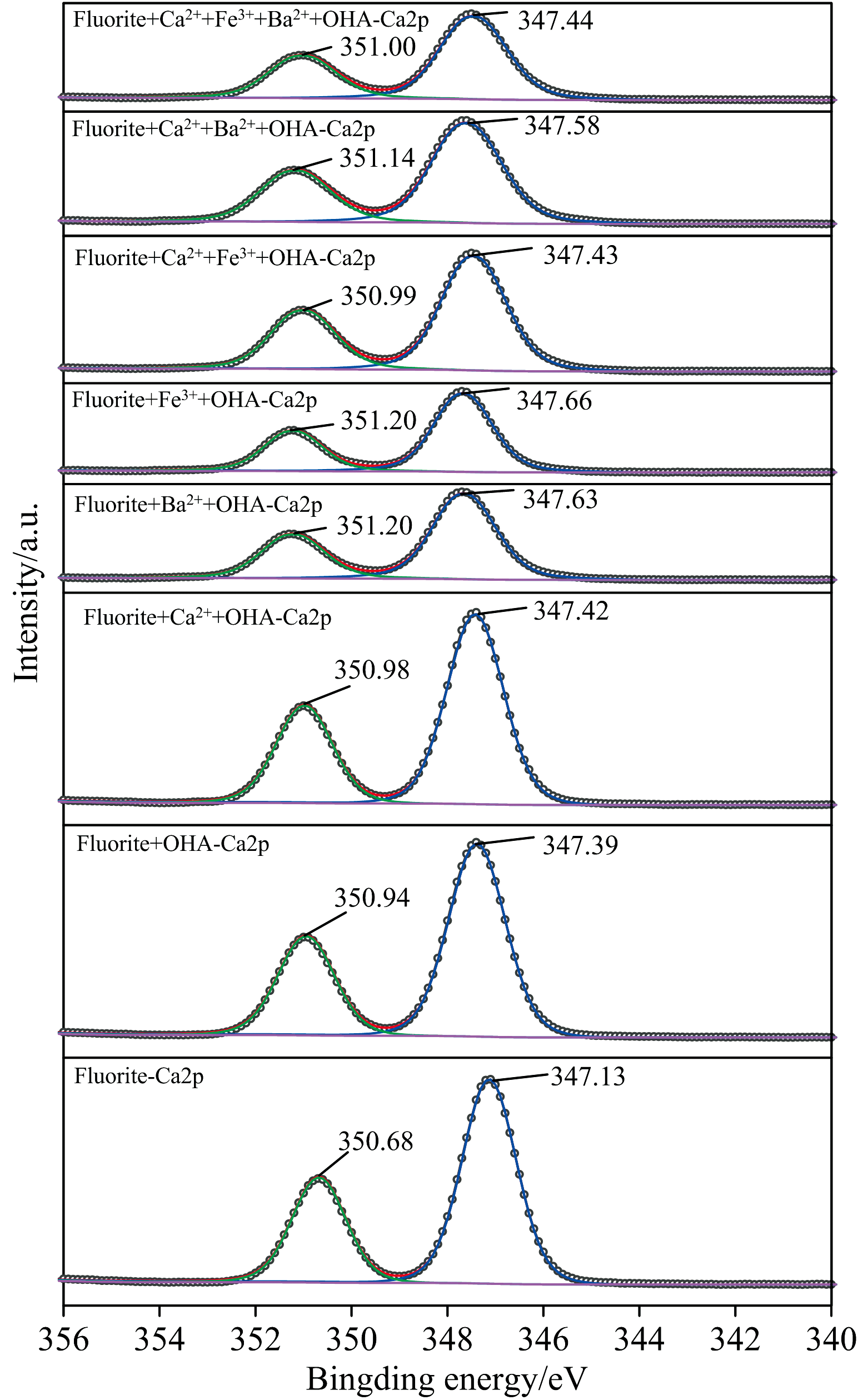 图7为萤石经药剂作用前后的Ca(2p)元素窄谱图, 药剂作用之前的萤石表面的Ca(2p)轨道峰可以拟合出两个峰, 347.13 eV处是Ca(2p)3/2的特征峰, 350.68 eV是Ca(2p)1/2的特征峰[19]。 经OHA处理后的萤石Ca(2p)的结合能发生了偏移, Ca(2p)偏移了0.26 eV, 说明捕收剂OHA在萤石表面Ca位点发生了吸附。 经金属离子和OHA处理萤石后, Ca(2p)的结合能偏移量更大, 偏移量为0.28~0.53 eV, 说明金属离子的加入, 使Ca(2p)的偏移量变大, 其中Fe3+处理萤石后表面Ca(2p)的偏移量最大, 从表2中也可以说明这一点。 说明Fe3+作用在萤石上, 替代了萤石表面Ca元素晶格位置, 成为萤石表面的吸附位点, 同样其他金属离子也是一样的原理, 形成Me— O— N新型键合方式。 从Ca(2p)轨道峰的光电子强度可以看出, 随着金属离子的加入, Ca(2p)轨道峰的光电子强度降低了, 原因可能是金属离子和OHA吸附在萤石表面, 造成表面的Ca相对浓度降低。