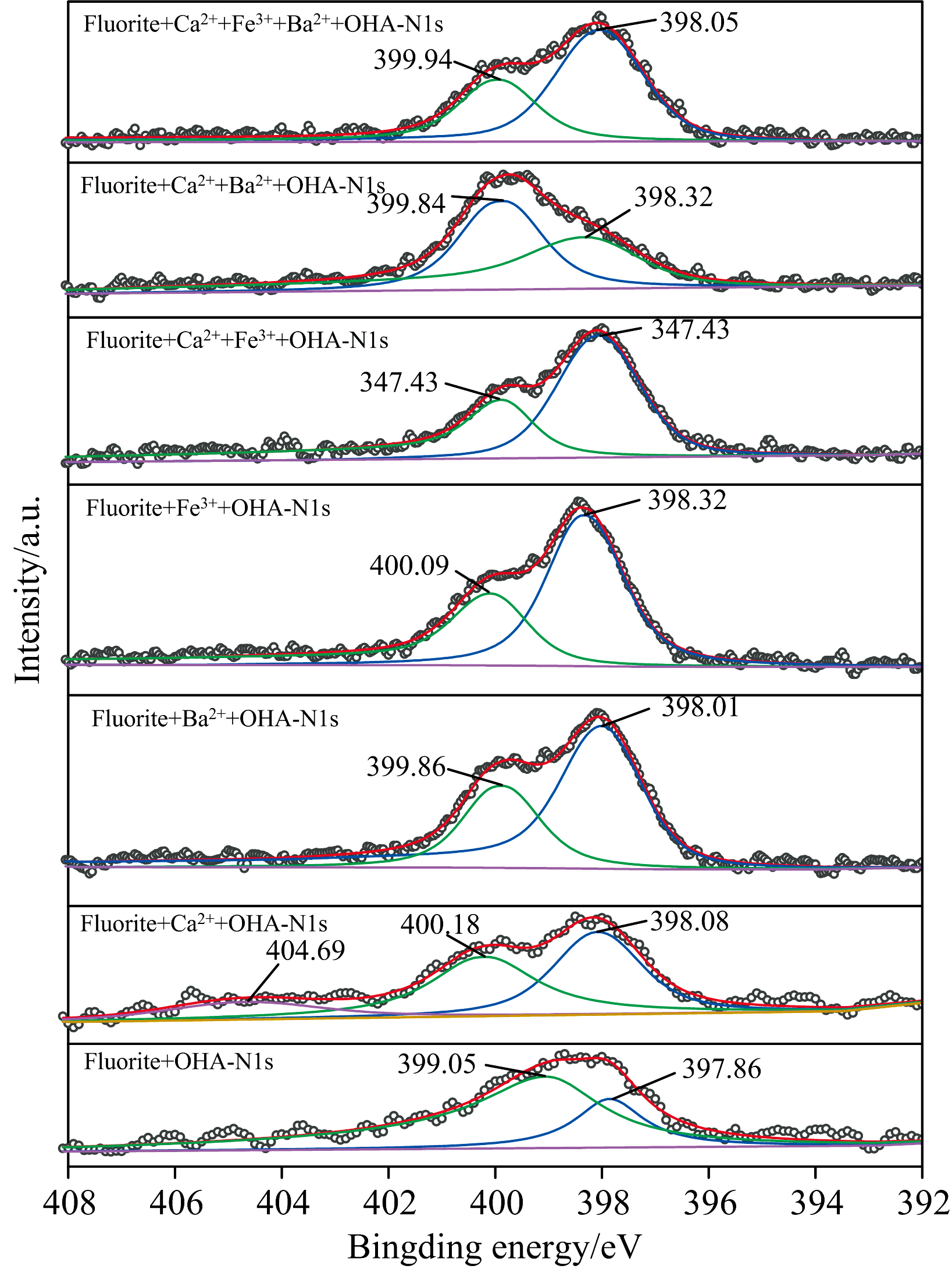 图8为OHA和金属离子处理后表面N元素窄谱区扫描拟合图谱。 经OHA处理的萤石表面N(1s), 可以看出出现两个拟合峰, 在399.05 eV归属于有机氮的峰, 在397.86 eV 处是金属氮的峰, 这可能是OHA中的氮原子的孤电子对萤石表面的Ca原子形成金属螯合物, 因此在397.86处可能是N— Ca 。 而通过添加Ca2+和OHA后, 萤石表面的N(1s)拟合峰发生了偏移, 其中金属氮的峰光电子强度增加, 说明萤石矿浆中添加Ca2+后, 会影响萤石与OHA的吸附方式, 增加了金属离子与OHA的吸附量, 形成Me— O— N新型键合方式, 同样其他金属离子的添加也会影响规律, 如图8所示。 原因是, 无论是单一金属离子Ba、 Fe还是混合金属离子Ca2+/Fe3+、 Ca2+/Ba2+、 Ca2+/Ba2+/Fe3+都会吸附在萤石表面, 与萤石表面断裂的F— 成键, 达到萤石表面电性平衡, 而吸附在表面的金属离子与OHA形成金属螯合物, 进而促进萤石表面N元素浓度的增多。 通过比较金属离子对萤石与OHA吸附量的影响, 得出以下吸附能力顺序: Fe3+> Ba2+> (Ca2+/Ba2+/Fe3+)≥ (Ca2+/Ba2+)≥ (Ca2+/Fe3+)> Ca2+, 这与表2可以相互应征。 说明混合金属离子可能发生竞争吸附, 影响萤石吸附OHA。