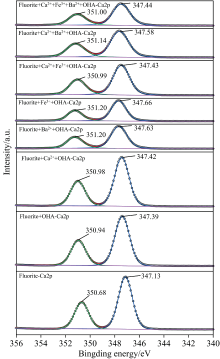 (3)XPS分析表明, 金属离子显著提升萤石对OHA的吸附量(均高于无离子处理)。 吸附机制为OHA通过Ca位点吸附(Ca(2p)结合能偏移); 金属离子(Ba2+, Fe3+)替代表面Ca晶格, 成为新吸附位点(进一步增大Ca(2p)偏移); 形成 Me— O— N新型键合(N(1s)峰偏移且强度增加)。 吸附能力顺序: Fe3+> Ba2+> (Ca2+/Ba2+/Fe3+)≥ (Ca2+/Ba2+)≥ (Ca2+/Fe3+)> Ca2+(混合离子具协同作用)。