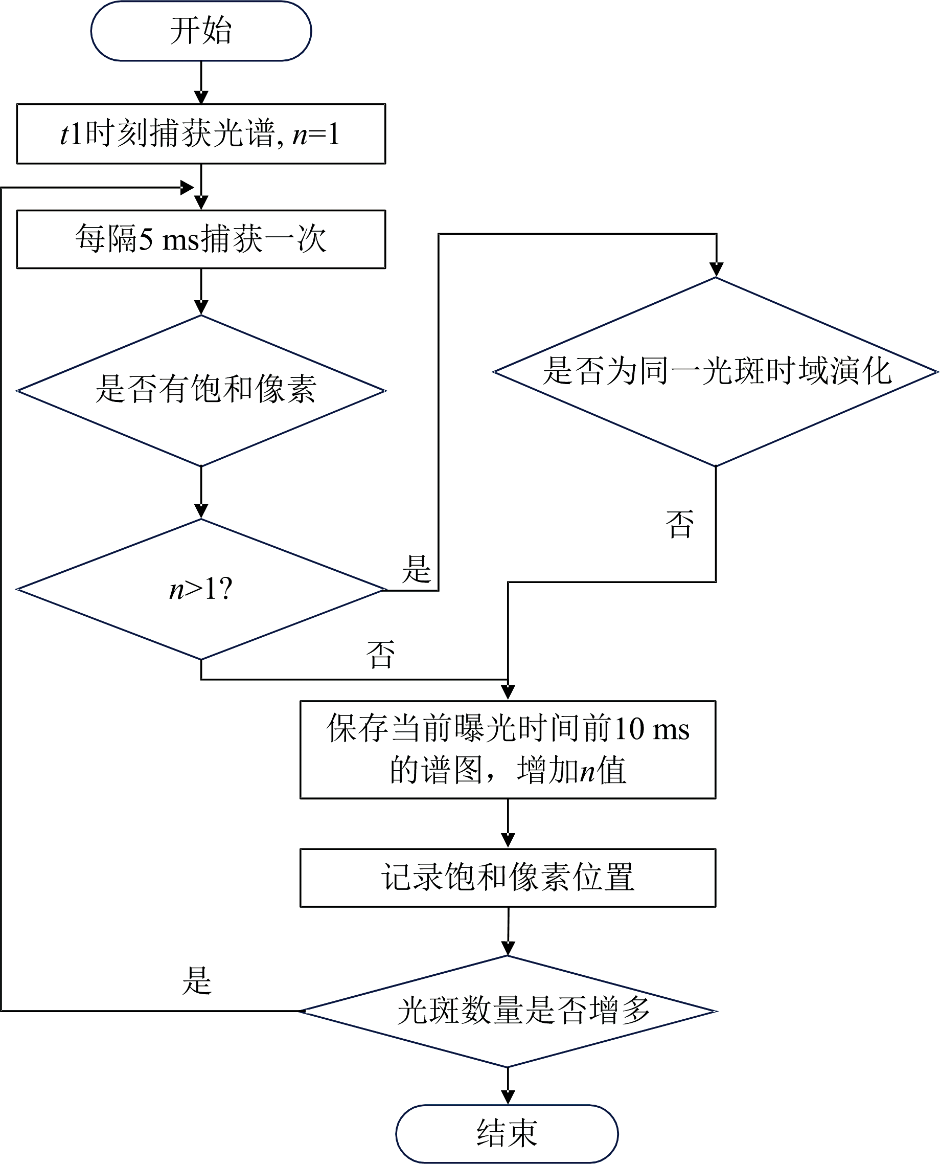 在确定初始曝光时间后, 系统进入动态光谱采集阶段, 测试发现, 仪器采用5ms为时间间隔进行递增曝光, 能够有效避免探测器响应不均匀。 CMOS相机自动捕获并进行实时判读, 其核心处理逻辑: 检测谱图中是否有饱和像素, 若有则分为两种情况: (1) 若首次检测到光斑内存在饱和像素, 直接保存当前曝光时间前10 ms的光谱图, 规避初始过曝风险; (2) 非首次检测到光斑内存在饱和像素, 此时也分两种情况: ①若当前饱和像素与之历史光斑的空间距离相差不超过5个像素, 即可认为此饱和像素为同一光斑的时域演化, 不保存当前谱图。 ②若检测到的饱和像素超出空间距离阈值, 判定为新饱和光斑, 保存当前曝光时间前10 ms的光谱图。 需要指出的是, 以上方法在一般环境扰动下能有效区分光斑的时域演化, 但在个别极端情况下导致光斑距离超过阈值的情况易将同一光斑误判为“ 新饱和光斑” , 因此为进一步提升谱图采集的准确性, 在空间距离判定的基础上, 引入光斑特征判读, 若光斑在曝光中特征保持一致, 即使空间距离超过5个像素, 仍判定为同一光斑的时域演化, 避免谱图采集冗余及有效信号丢失。