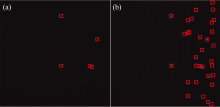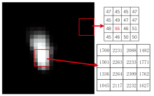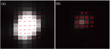 最后进行信号光斑的质心提取, 根据信号光斑弥散特性设置窗口判别条件, 探测窗口中包含了光斑的全部有效光强信息。 针对光斑分布形态各不相同的情况, 采用自动化窗口选择: 若光斑半高宽≤ 3像素采用离散质点模型; 若光斑半高宽> 3像素采用连续质量分布模型, 每个探测窗口仅包含一个光斑信号, 保证准确判别信号光斑的同时可以减少运算量、 提高运算效率。 光斑探测窗口的判别条件: (1) 中心像素值高于领域均值。 (2) 像素区域的像素累计值超过相邻区域总和。 满足条件的区域被判定为有效光斑, 其中心像素点为光斑的强度极大值所在像素, 从而可以得出光斑质心的坐标位置。