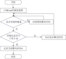 用于中阶梯光栅光谱仪的多曝光累计融合法, 采用FPGA时序控制架构实现CMOS相机自动化曝光管理。 为适配复杂应用环境下的光谱检测需求, 采取二分搜索策略迭代调整初始曝光时间, 给定总曝光时间范围0~5 000 ms为搜索区间, 初始捕获时间t0=2 500 ms, 每捕获一张谱图, 会由后台程序进行自动化判读: 若识别到当前谱图中无饱和像素, 则向后延长曝光时间; 若检测到饱和像素, 则向前缩短曝光时间。 由于光斑信号的检测阈值与信噪比[12]有关, 信号强度必须大于噪声强度, 考虑在实际应用中的可靠性, 设定信噪比大于等于10, 信号能被可靠检测提取, 同步结合像素值与信噪比, 在无像素达到饱和且光斑信噪比高于临界阈值条件下, 将这个时间作为实验的初始捕获时间t1, 该方法通过软硬件协同创新, 提升了谱图采集的效率。