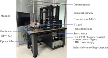 实验平台如图1所示, 光伏电池如图2所示。 光致发光装置包括用于光伏电池激发的光源和用于信号采集的相机。 该装置主要由以下部分组成: 一台自主开发的640× 512分辨率InGaAs面阵相机[配备TAWOV的GF5018M SWIR镜头和用于减少环境光影响的(1 150± 50) nm 带通滤波器]部分性能参数如表1所示, 光伏电池、 850 nm LED阵列、 快速PWM斩波恒流电源、 平移台以及上位控制计算机。 该检测设备所用的光源尺寸为30 cm× 30 cm, 中心波长为850 nm。 使用此光源进行光致发光激发实验, 同时通过调节光源的输入电流来改变实验中的功率。 随后, 对原始PL图像的灰度分布信息进行分析。
