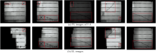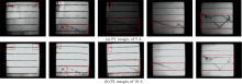 实验中使用了一种调制光源作为激发光源, 在两次独立的激发实验中, 保持其输入激励电压为28 V不变, 改变光源的输入电流, 电流大小分别设置为5和10 A。 图3展示了在这两种激发条件下捕获的PL图像, 其中光伏电池的缺陷均用红色矩形标记。 此外, 还在每种激发条件下多次测量了相应的激发条件下光伏电池对应的辐照电压。